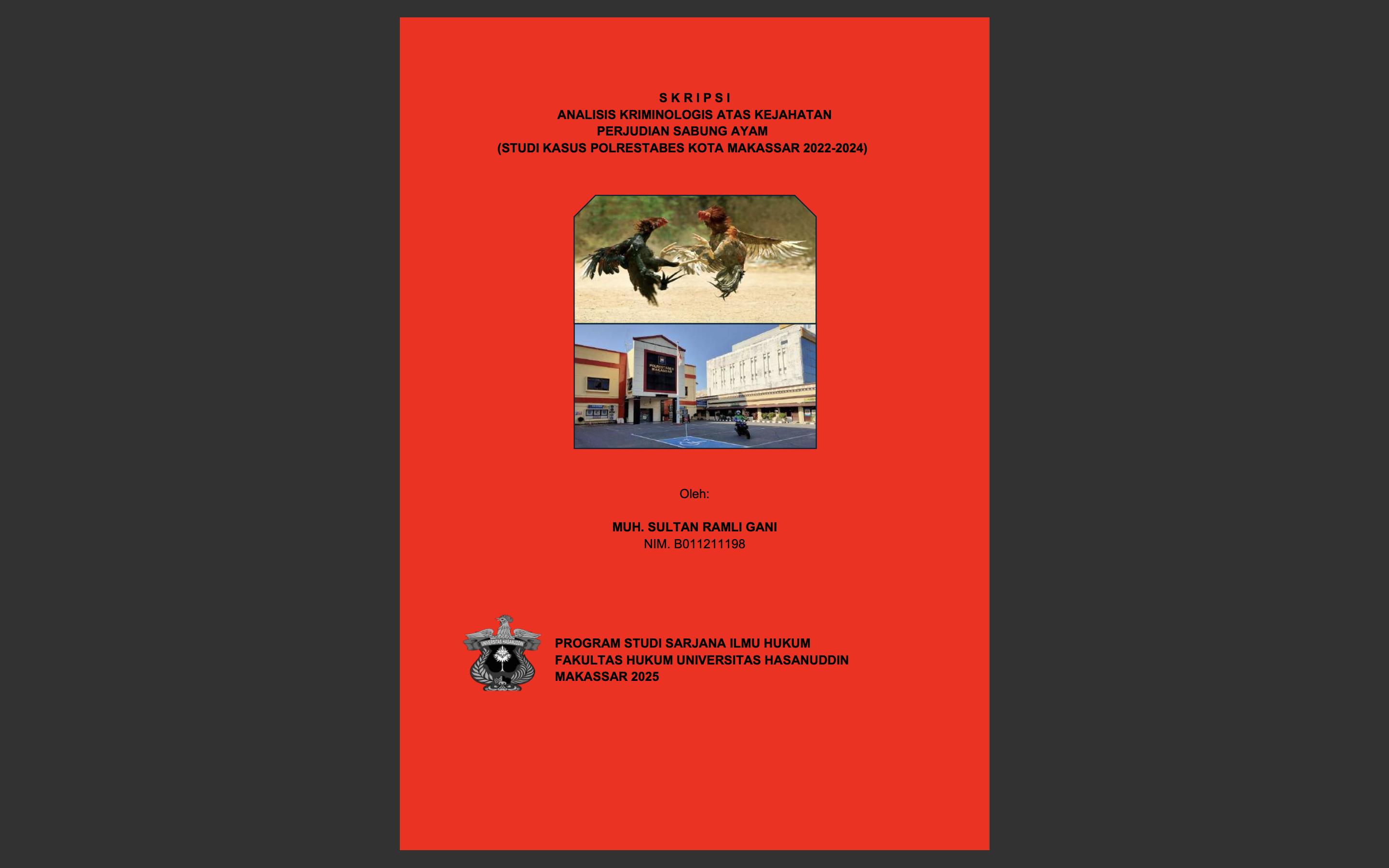 GANI, MUH. SULTAN RAMLI (2025) ANALISIS KRIMINOLOGIS ATAS KEJAHATAN PERJUDIAN SABUNG AYAM (STUDI KASUS POLRESTABES KOTA MAKASSAR 2022-2024) = Criminological Analysis of the Crime of Cockfighting Gambling (Case Study of Makassar City Police Station 2022-2024). Skripsi thesis, UNIVERSITAS HASANUDDIN.