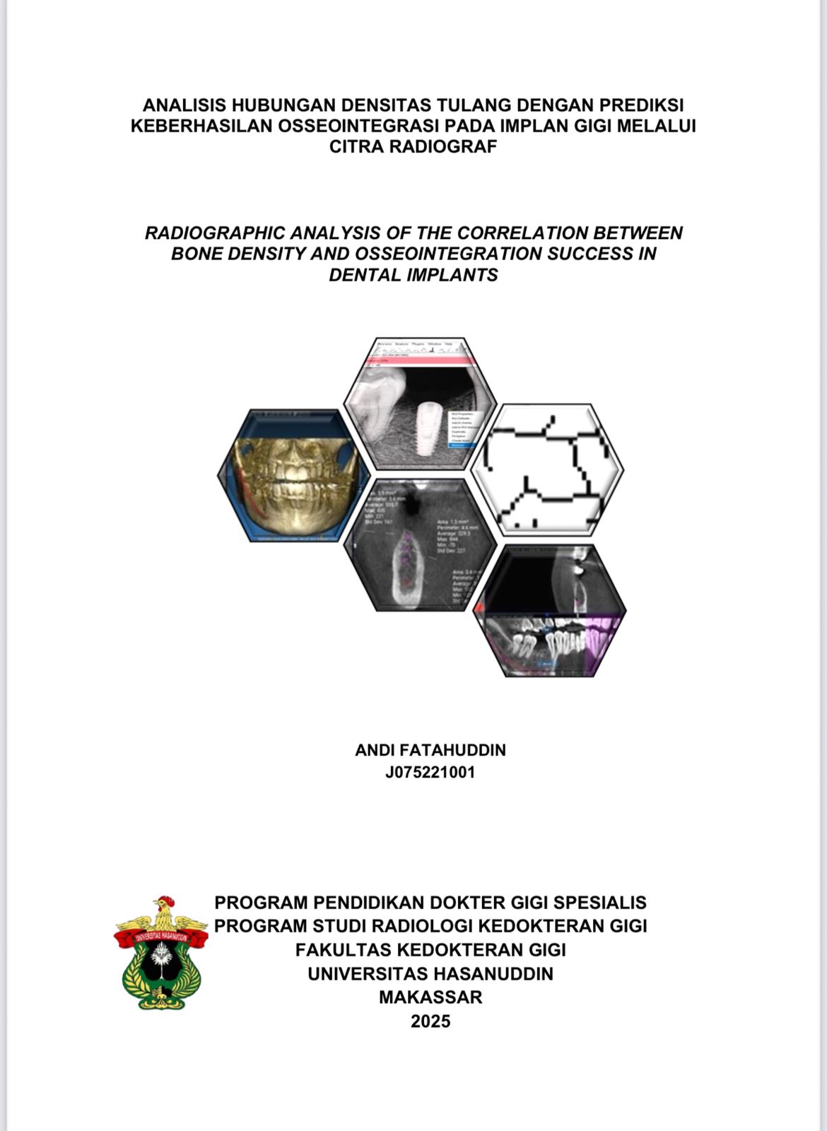 ABSTRAK ANDI FATAHUDDIN. "Analisis Hubungan Densitas Tulang Dengan Prediksi Keberhasilan Osseointegrasi Pada Implan Gigi Melalui Citra Radiograf (Dibimbing oleh Barunawaty Yunus dan Fadhlil Ulum A. Rahman) Latar Belakang: Keberhasilan perawatan implan gigi sangat bergantung pada proses yang saling mendukung dalam fase penyembuhan tulang dan kemampuan regenerasi jaringan untuk mendapatkan implan gigi yang terintegrasi secara osseus dengan tulang alveolar. Pencitraan radiologis memiliki peran sentral dalam seluruh tahapan terapi implan, mulai dari penilaian awal densitas dan volume tulang, panduan saat pembedahan, hingga evaluasi osseointegrasi pasca penempatan implan. Plugin Bone J merupakan implementasi khusus dari plugin yang mendefinisikan ketebalan pada suatu titik sebagai diameter untuk menghitung rata-rata dan deviasi standar trabecula thickness (Tb.Th) dan trabecula space (Tb.Sp) secara langsung dari nilai piksel, Tujuan: Menganalisis korelasi antara densitas tulang sebelum penempatan implan yang diukur melalui citra CBCT dengan keberhasilan osseointegrasi setelah penempatan implan yang dievaluasi melalui citra radiograf periapikal. Metode: Penelitian observasional analitik cross-sectional dilakukan dengan menggunakan 25 Citra radiografi CBCT format DICOM dan 25 citra radiografi periapikal pada Rumah Sakit Gigi dan Mulut Universitas Hasanuddin. Subjek dikategorikan berdasarkan kelompok preimplan dengan eavaluasi citra radiograt CBCT dan Post Implan dengan evaluasi citra radiograf periapikal pada pasien yang sama. Nilai Densitas diukur menggunakan perangkat lunak AIS3D dan citra radiograf periapika dengan ImageJ Plugin Bone J. Analisis statistik meliputi uji Kruskal-Wallis, koreksi Bonferroni post-hoc, korelasi Spearman, dan uji Simple Linera regresion dan Multiple Linear Regresion Hasil: Terdapat nilai koefisien korelasi Pearson sebesar 0,705 dengan nilai signifikansi 0,000 (p < 0,01). Ini menunjukkan hubungan yang kuat dan signifikan secara statistik antara jumlah trabekula post dengan densitas trabekula pre implant.. tidak terdapat variabel independen yang menunjukkan pengaruh signifikan secara statistik terhadap jumlah trabekular. Densitas puncak alveolar memiliki koefisien -0,002 dengan nilai signifikansi 0,273, menunjukkan hubungan negatif yang tidak signifikan. Densitas ½ apikal memiliki koefisien 0,001 (p = 0,600), dan densitas ujung apikal memiliki koefisien 0,003 (p = 0,419); keduanya menunjukkan arah hubungan positif, tetapi tidak signifikan. Densitas tulang pre-implant pada ketiga lokasi tersebut belum dapat dijadikan prediktor yang kuat terhadap jumlah trabekular post-implant. Kesimpulan: Nilai densitas sebelum pemasangan implan berpotensi menjadi indikator awal memprediksi keberhasilan osseointegrasi sebelum perawatan. Namun dari hasil analisis regresi linier, densitas tulang sebelum implant belum dapat menjadi prediktor utama secara signifikan terhadap keberhasilan osseointegrasi