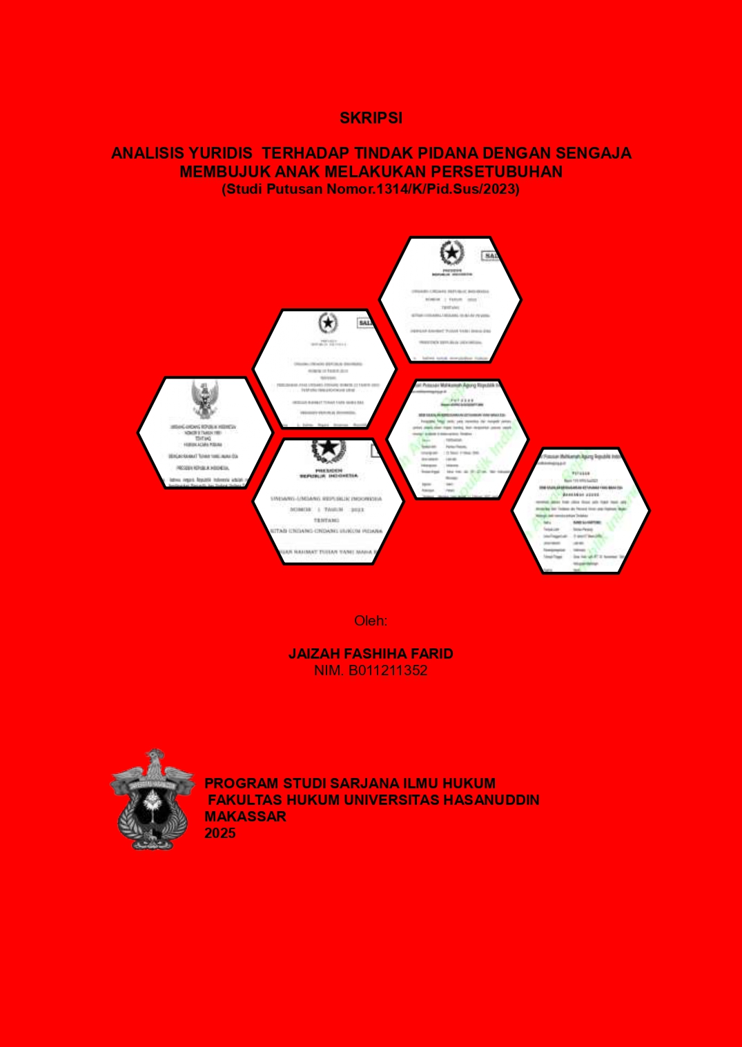 JAIZAH FASHIHA FARID (B011211352).Analiss Yuridis Terhadap Tindak Pidana dengan Sengaja Membujuk Anak Melakukan Persetubuhan (Studi Putusan Nomor.1314/K/Pid.Sus/2023). Dibimbing oleh Audyna Mayasari Muin sebagai Pembimbing. Latar Belakang: Bentuk kekerasan seksual yang sering terjadi kepada anak adalah persetubuhan dengan pembujukan, Namun persetubuhan anak tidak harus dalam bentuk paksaan tetapi juga dapat melalui suatu hubungan yang harmonis yang di dalamnya terdapat sejumlah manipulasi. Tujuan: Penelitian ini bertujuan untuk menganalisis kualifikasi tindak pidana dengan sengaja membujuk anak melakukan persetubuhan dalam perspektif hukum pidana dan menganalisis pertimbangan hukum oleh majelis hakim terhadap tindak pidana dengan sengaja membujuk anak melakukan persetubuhan dalam putusan nomor.1314/K/Pid.Sus/2023. Metode: Penelitian ini menggunakan jenis penelitian hukum normatif, dengan menggunakan metode pendekatan perundang-undangan dan pendekatan kasus. Jenis bahan hukum yang digunakan, yaitu bahan hukum primer dan sekunder yang diperoleh dengan menggunakan studi kepustakaan dan studi dokumen. Hasil: Hasil yang diperoleh dalam penelitian ini, yaitu: (1) Tindak pidana dengan sengaja membujuk anak melakukan persetubuhan dikualifikasikan berdasarkan undang-undang yang berlaku, serta ketentuan dalam Kitab Undang-undang Hukum Pidana. Ketika terjadi tindak pidana persetubuhan terhadap anak atas dasar dengan sengaja membujuk anak melakukan persetubuhan maka merupakan delik biasa dan dikualifikasikan pada pasal 76D, Pasal 81 ayat(1), Pasal 81 ayat (2) Undang Undang Perlindungan Anak.(2) Pertimbangan majelis hakim dalam putusan no. 1314/K/Pid.Sus tidak mempertimbangkan aspek anak pada kasus persetubuhan yang dalam pertimbanganya dalam hal bersedianya korban melakukan persetubuhan. Kesimpulan: Menurut penulis hakim harus mempertimbangkan undang-undang perlindungan anak yang dibuat dengan tujuan untuk melindungi anak-anak dari segala perbuatan baik itu karena suka sama suka dan, pembujukan, terlebih jika ada pemaksaan.