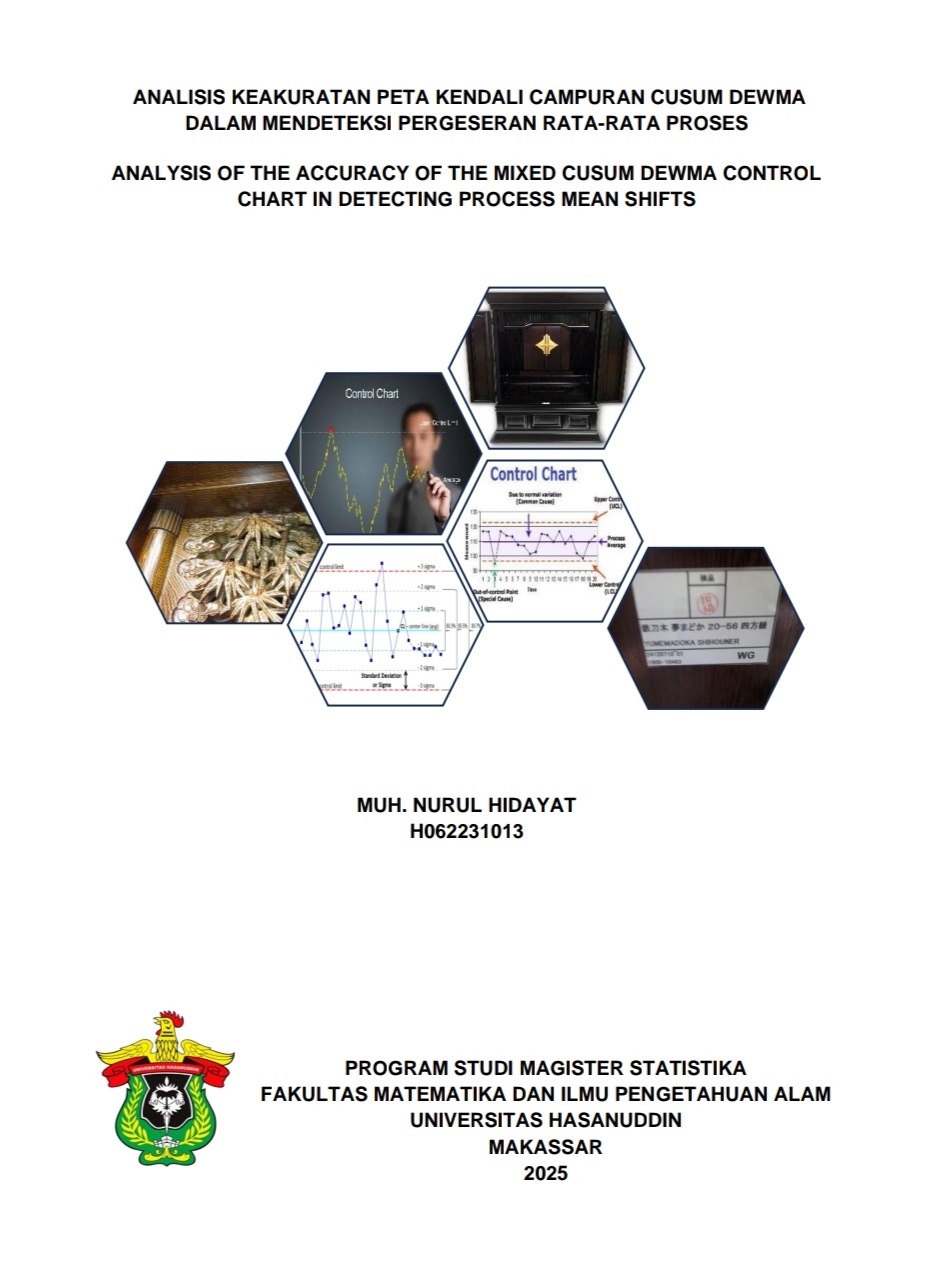 HIDAYAT, MUH. NURUL (2025) ANALISIS KEAKURATAN PETA KENDALI CAMPURAN CUSUM DEWMA DALAM MENDETEKSI PERGESERAN RATA-RATA PROSES = ANALYSIS OF THE ACCURACY OF THE MIXED CUSUM DEWMA CONTROL CHART IN DETECTING PROCESS MEAN SHIFTS. Thesis thesis, Universitas Hasanuddin.