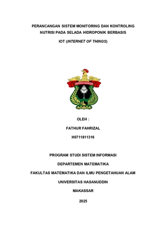 ABSTRAK FATHUR FAHRIZAL. Perancangan sistem monitoring dan kontroling nutrisi pada selada hidroponik berbasis iot (internet of thing) (dibimbing oleh Muhammad Hasbi, dan Rozalina Amran). Latar belakang. Perkembangan teknologi digital telah memberikan kontribusi signifikan terhadap budidaya tanaman hidroponik, khususnya melalui sistem Nutrient Film Technique (NFT) yang efisien dan cocok diterapkan di daerah tropis seperti Sulawesi. Namun, tantangan utama dalam budidaya selada Grand Rapids (Lactuca sativa L.) adalah menjaga konsistensi kadar nutrisi dalam larutan. Tujuan. Penelitian ini bertujuan untuk merancang dan mengevaluasi sistem monitoring serta kontrol otomatis berbasis IoT menggunakan mikrokontroler ESP32, guna mengoptimalkan pemberian nutrisi tanaman selada dalam sistem hidroponik NFT. Metode. Metode penelitian menggunakan pendekatan waterfall, meliputi analisis kebutuhan, desain sistem, implementasi, pengujian, dan evaluasi. Sistem dirancang menggunakan ESP32, sensor TDS dan pH, serta integrasi Firebase dan aplikasi Android. Hasil. Hasil pengujian selama tiga hari menunjukkan sistem mampu menjaga kestabilan TDS dalam kisaran 500–800 ppm dan pH antara 5.0–6.5. Pompa peristaltik bekerja otomatis sesuai kondisi aktual, dan data sensor tersinkronisasi dengan Firebase secara real-time. Sensor pH dan TDS menunjukkan akurasi pembacaan yang baik, sementara aplikasi Android mempermudah pemantauan jarak jauh. Kesimpulan. Sistem monitoring dan kontrol nutrisi berbasis IoT yang dirancang telah terbukti efektif dalam menjaga kestabilan nutrisi dan pH, serta meningkatkan efisiensi dan kenyamanan budidaya selada hidroponik metode NFT secara otomatis dan presisi. Kata kunci: pertanian cerdas; larutan AB Mix; mikrokontroler ESP32; pemantauan pH; sensor TDS; kontrol otomatis.