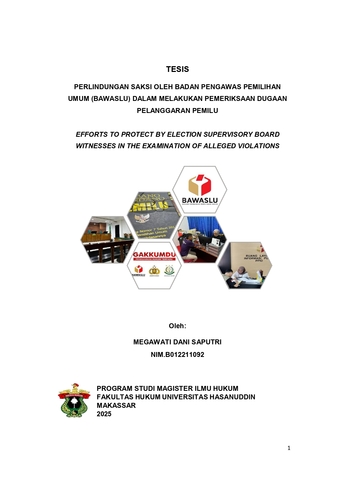 SAPUTRI, MEGAWATI DANI (2025) PERLINDUNGAN SAKSI OLEH BADAN PENGAWAS PEMILIHAN UMUM (BAWASLU) DALAM MELAKUKAN PEMERIKSAAN DUGAAN PELANGGARAN PEMILU = EFFORTS TO PROTECT BY ELECTION SUPERVISORY BOARD WITNESSES IN THE EXAMINATION OF ALLEGED VIOLATIONS. Skripsi thesis, UNIVERSITAS HASANUDDIN.