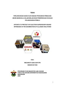 MEGAWATI DANI SAPUTRI (B012211092). “PERLINDUNGAN SAKSI OLEH BADAN PENGAWAS PEMILIHAN UMUM (BAWASLU) DALAM MELAKUKAN PEMERIKSAAN DUGAAN PELANGGARAN PEMILU”. Dibimbing oleh Aminuddin Ilmar sebagai Pembimbing Utama dan Amir Ilyas sebagai Pembimbing Pendamping. Latar Belakang. Pelanggaran terhadap pelaksanaan Pemilihan Umum masih sering terjadi, dalam proses pemeriksaan saksi sebagai paniitia pengawas pemilu menjadi korban. Penelitian bertujuan untuk menganalisis bentuk perlindungan terhadap saksi dalam pemeriksaan pelanggaran pemilihan umum.Metode. Dalam penelitian ini, penulis akan menggunakan metode penelitian hukum normatif empiris. Penelitian normatif empiris dipahami sebagai penelitian untuk menguji suatu norma atau ketentuan yang berlaku. Metode analisis data yang digunakan dalam penelitian ini adalah analisis deskriptif, yaitu menganalisis data dari kepustakaan dengan cara menjelaskan dan memaparkan hasil atau kenyataan yang akan disusun secara logis. Data yang telah dikumpulkan kemudian diolah dan dikaji secara mendalam sehingga diperoleh gambaran yang utuh mengenai persoalan hukum yang diteliti.Hasil. Temuan dalam penelitian ini adalah Implementasi Perlindungan Saksi Dalam Proses Pemeriksaan Dugaan Penanganan Pelanggaran Pemilu Oleh Badan Pengawas Pemilihan Umum dari segi perlindungan hukum preventif dan perlindungan hukum represif. Proses pemilu dengan fungsi sebagai pencegah terjadinya pelanggaran pemilu, membangun rasa aman kepada masyarakat, dan menjunjung nilai-nilai demokrasi yaitu transparansi, ketidakberpihakan dan keadilian pemilu. Adanya kekosongan norma hukum pada aturan Badan Pengawas Pemilu (Bawaslu) agar dibentuk aturan dan regulasi berkaitan perlindungan saksi pada penanganan pelanggaran pemilu mengingat pentingnya peran saksi terhadap proses penegakan hukum pemilu. Kesimpulan.Perlindungan hukum preventif terhadap perlindungan saksi oleh Badan Pengawas Pemilu dalam proses pencegahan berupa partisipasi masyarakat dimana pengawasan partisipatif dengan mengajak masyarakat untuk melapor atau memberikan informasi apabila terjadi dugaan pelanggaran pemilu. Sedangkan, Perlindungan hukum represif terhadap perlindungan saksi dalam proses pemeriksaan dugaan pelanggaran pemilu bahwa keterangan saksi sebagai alat bukti merupakan suatu kontribusi yang sangat besar. Berhadapan dengan kendala yang terjadi pada saat proses penindakan dugaan pelanggaran pemilu perlu membentuk aturan atau regulasi adanya perlindungan saksi sehingga dalam proses penindakan dugaan pelanggaran pemilu.