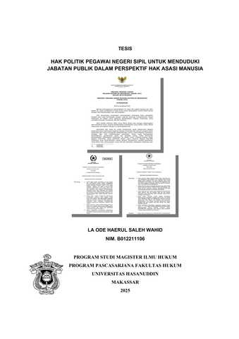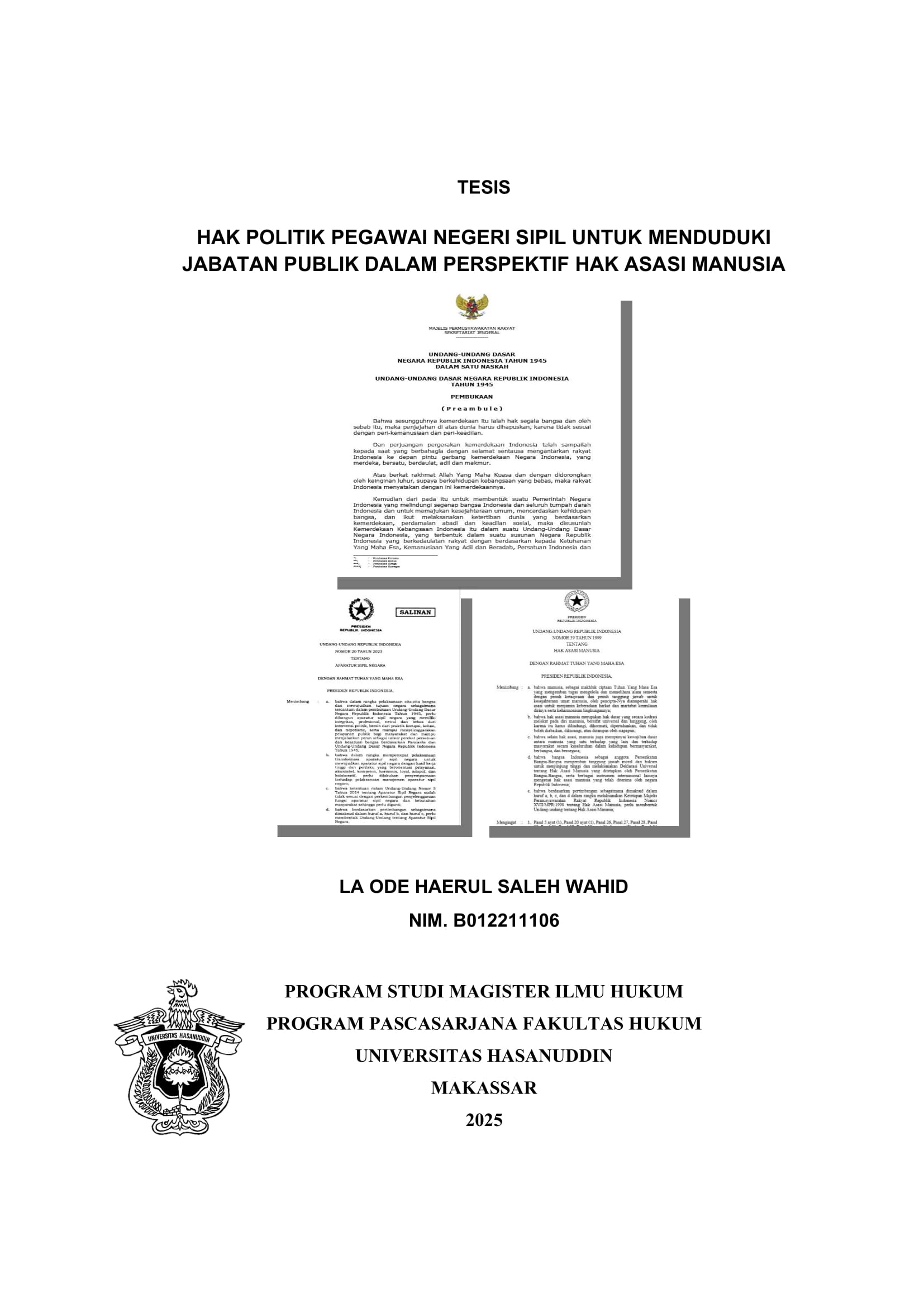 SALEH WAHID, LA ODE HAERUL (2025) HAK POLITIK PEGAWAI NEGERI SIPIL UNTUK MENDUDUKI JABATAN PUBLIK DALAM PERSPEKTIF HAK ASASI MANUSIA = Political Rights of Civil Servants to Hold Public Offices in the Perspective of Human Rights. Skripsi thesis, UNIVERSITAS HASANUDDIN.