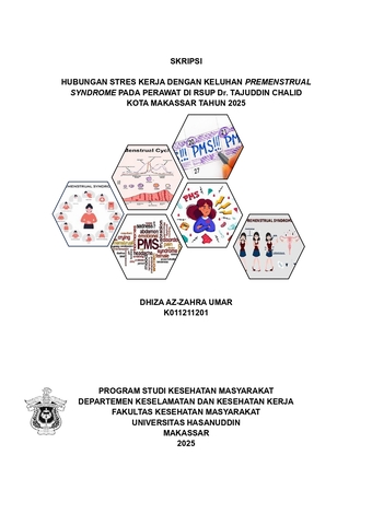 UMAR, DHIZA AZ-ZAHRA (2025) HUBUNGAN STRES KERJA DENGAN KELUHAN PREMENSTRUAL SYNDROME PADA PERAWAT DI RSUP Dr. TAJUDDIN CHALID KOTA MAKASSAR TAHUN 2025 = The Relationship Between Work Stress and Premenstrual Syndrome Complaints Among Nurses at Dr. Tadjuddin Chalid Central General Hospital, Makassar City, 2025. Skripsi thesis, UNIVERSITAS HASANUDDIN MAKASSAR.