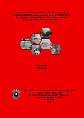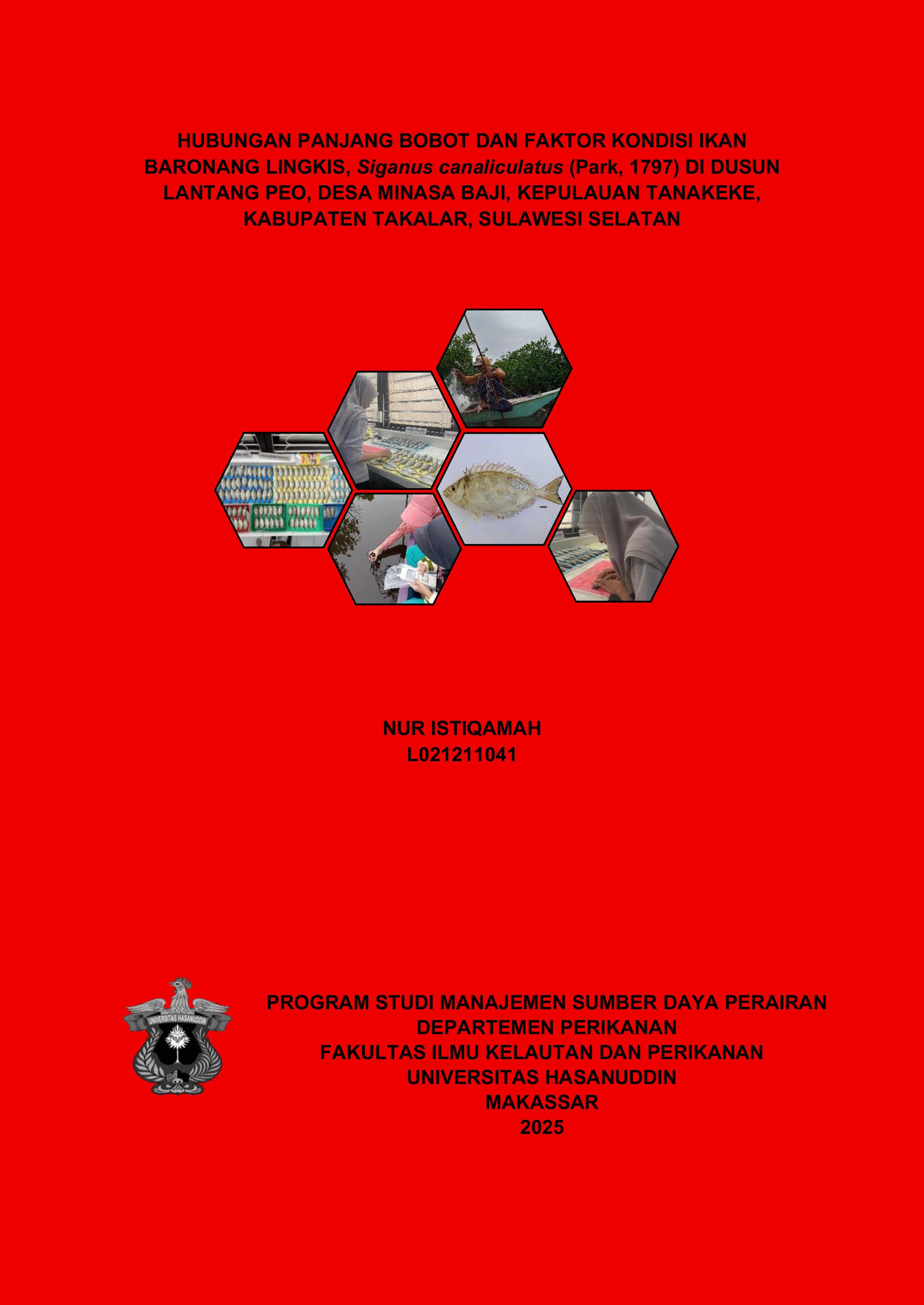 NUR ISTIQAMAH. Hubungan Panjang Bobot Dan Faktor Kondisi Ikan Baronang Lingkis, Siganus canaliculatus (Park, 1797) di Dusun Lantang Peo, Desa Minasa Baji, Kepulauan Tanakeke, Kabupaten Takalar, Sulawesi Selatan, dibimbing oleh Sharifuddin Bin Andy Omar. Latar belakang. Kepulauan Tanakeke merupakan gugusan pulau-pulau kecil yang memiliki sumber daya alam kelautan yang melimpah. Kepulauan ini merupakan bagian dari wilayah Kabupaten Takalar di mana letaknya yang strategis untuk dikembangkan dengan basis kegiatan ekonomi pada pemanfaatan sumber daya alam dan jasa-jasa lingkungan (environmental services). Salah satu kelimpahan sumber daya kelautan yang ada pada Kepulauan Tanakeke adalah ikan baronang lingkis (S. canaliculatus). Metode. Penelitian ini dilaksanakan pada bulan Desember 2024 hingga Februari 2025 dengan melakukan tiga bulan pengambilan sampel di Dusun Lantang Peo, Desa Minasa Baji Kepulauan Tanakeke. Analisis sampel ikan baronang lingkis (S. canaliculatus) dilakukan di Laboratorium Biologi Perikanan. Panjang tubuh diukur menggunakan mistar digital dengan ketelitian 0,01 mm dan bobot tubuh ditimbang menggunakan timbangan digital dengan ketelitian 0,01 g. Hasil. Jumlah total ikan yang diperoleh secara keseluruhan sebanyak 413 ekor yang terdiri atas 286 ekor ikan jantan dan 127 ekor ikan betina. Persamaan regresi hubungan panjang-bobot gabungan ikan baronang lingkis jantan dan betina pada bulan Desember, Januari dan Februari secara berturut-turut adalah W= 0,000015L3.0031, W= 0,000013L3,0134, dan W= 0,000010L3,0932. Rerata nilai faktor kondisi ikan baronang lingkis baik berdasarkan waktu pengambilan sampel seluruhnya lebih besar dari satu (>1). Kesimpulan. Tipe pertumbuhan ikan baronang jantan dan betina pada bulan Desember, Januari( untuk ikan betina) dan Februari menunjukkan pola pertumbuhan isometrik, di bulan Januari pada ikan jantan yang menunjukkan pola pertumbuhan alometrik negatif pertambahan panjang tubuh lebih cepat dari pertambahan bobot tubuh ikan. Berdasarkan nilai faktor kondisi yang diperoleh selama penelitian menunjukkan Kepulauan Tanakeke mendukung perumbuhan ikan baronang lingkis.
