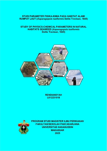 ABSTRAK Rendiansyah L012231018 “Studi Parameter Fisika-Kimia Pada Habitat Alami Rumput Laut (Asparagopsis taxiformis Delile Trevisan, 1845)” dibimbing oleh Joeharnani tresnati dan Gunarto Latama” Latar belakang: Aspek Parameter fisika-kimia pada habitat rumput laut Red Sea Plume Aspragopsis taxiformis di pesisir desa binanga, Sulawesi Barat, Indonesia. Rumput laut Asparagopsis taxiformis (Delile Trevisan, 1845) merupakan jenis rumput laut merah yang hidup di perairan tropis maupun hangat. Kondisi habitat rumput laut Asparagopsis taxiformis masih belum banyak dipelajari terkait parameter fisika- kimianya, studi tentang parameter fisika-kimia perairan sangat penting untuk mengetahui kondisi kualitas air untuk mendukung pertumbuhan rumput laut Asparagopsis taxiformis. Oleh karena itu, diperlukan metode yang sesuai untuk mempelajari parameter fisika-kimia rumput laut Asparagopsis taxiformis untuk tujuan budidaya secara terkontrol. Tujuan: Penelitian ini bertujuan untuk menganalisis aspek parameter fisika-kimia pada habitat alami rumput laut Asparagopsis taxiformis di pesisir desa binanga, sulawesi barat. Penelitian ini dilakukan dari bulan Maret hingga Agustus 2024 di lima stasiun pengambilan sampel di pesisir desa baluno, sebuah tempat wisata mlc baluno. Metode: Penelitian ini menggunakan metode eksploratif dengan teknik Purposive Sampling dan transek kuadran yang dilakukan di habitat alami rumput laut Asparagopsis taxiformis dan menggunakan analisis Principal Component Analysis (PCA). Parameter yang diamati meliputi parameter fisika seperti kecepatan arus, kekeruhan, intensitas cahaya, kedalaman, suhu, dan tinggi gelombang, Sedangkan parameter kimia meliputi pH, oksigen terlarut, salinitas, ammonia, nitrat, fosfat, karbon dioksida, ammonium dan alkalinitas. Hasil: Penelitian menunjukkan bahwa habitat alami rumput laut Asparagopsis taxiformis berkolerasi kuat pada kecepatan arus, kedalaman, tinggi gelombang, substrat, fosfat, alkalinitas, dan karbon dioksida berdasarkan analisis PCA. Di dalam area penelitian, rumput laut Asparagopsis taxiformis hanya ditemukan pada stasiun 3, sedangkan stasiun 1, 2, 4, dan 5 tidak ditemukan rumput laut Asparagopsis taxiformis. Kesimpulan: Penelitian ini menunjukkan bahwa parameter fisika-kimia memengaruhi keberadaan rumput laut Asparagosis taxiformis, dan perlu diperhatikan ketika ingin melakukan budidaya rumput laut Asparagopsis taxiformis. Hasil penelitian ini memberikan wawasan tentang habitat yang disukai dan faktor penentu keberadaan dan pertumbuhan rumput laut Asparagopsis taxiformis.