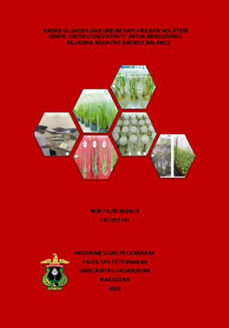 MUHLIS, NUR FAJRI (2025) Kadar Glukosa Dan Ureum Sapi Friesian Holstein Diberi Green Concentrate Untuk Mengurangi Kejadian Negative Energy Balance = Glucose and Urea Levels in Friesian Holstein Cows Feed Green Concentrate to Reduce Negative Energy Balance Incidents. Skripsi thesis, Universitas Hasanuddin.