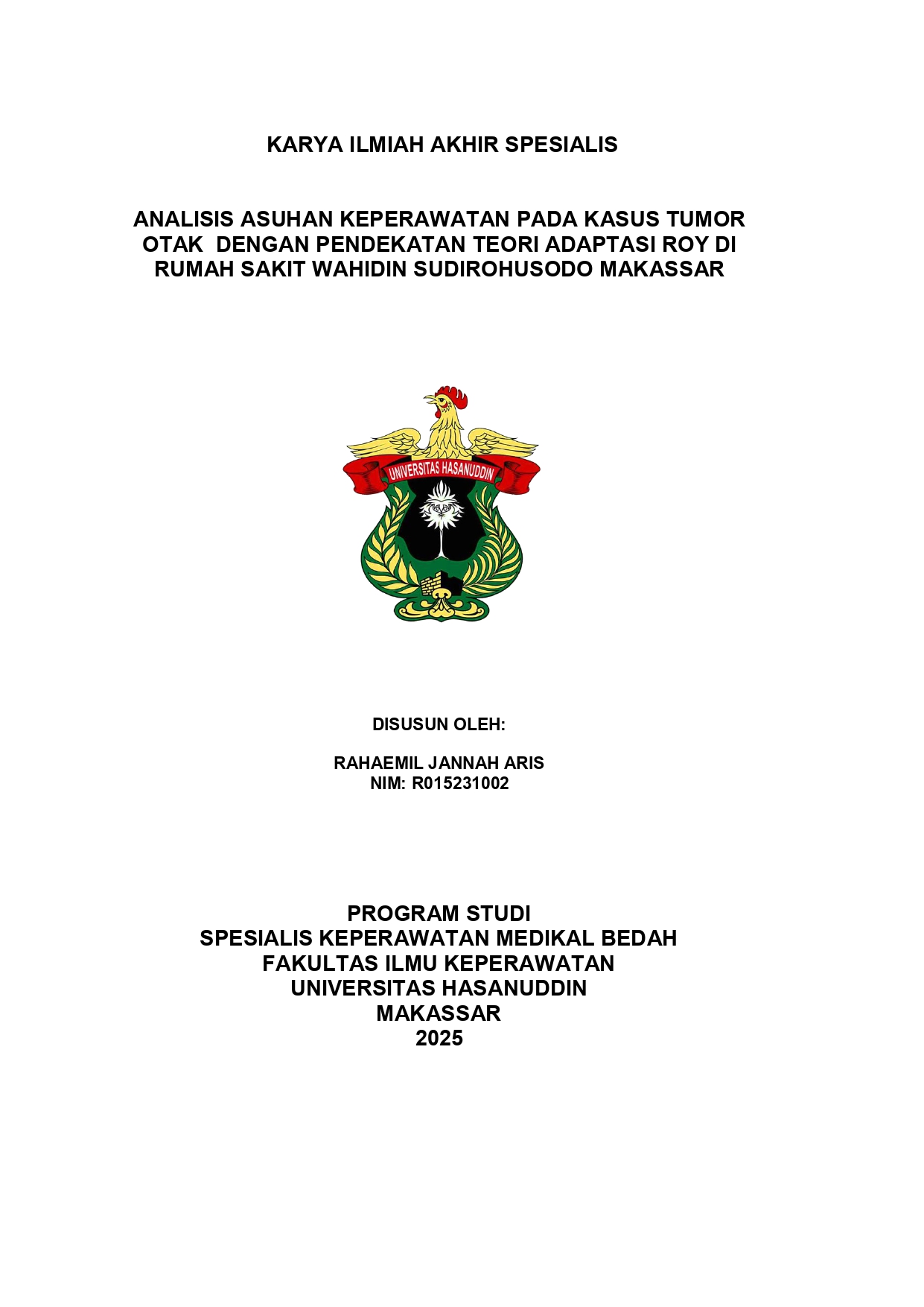 ARIS, RAHAEMIL JANNAH (2025) ANALISIS ASUHAN KEPERAWATAN PADA KASUS TUMOR OTAK DENGAN PENDEKATAN TEORI ADAPTASI ROY DI RUMAH SAKIT WAHIDIN SUDIROHUSODO MAKASSAR = ANALYSIS OF NURSING CARE IN BRAIN TUMOR CASES WITH ROY'S ADAPTATION THEORY APPROACH AT WAHIDIN SUDIROHUSODO HOSPITAL, MAKASSAR. Thesis thesis, Universitas Hasanuddin.