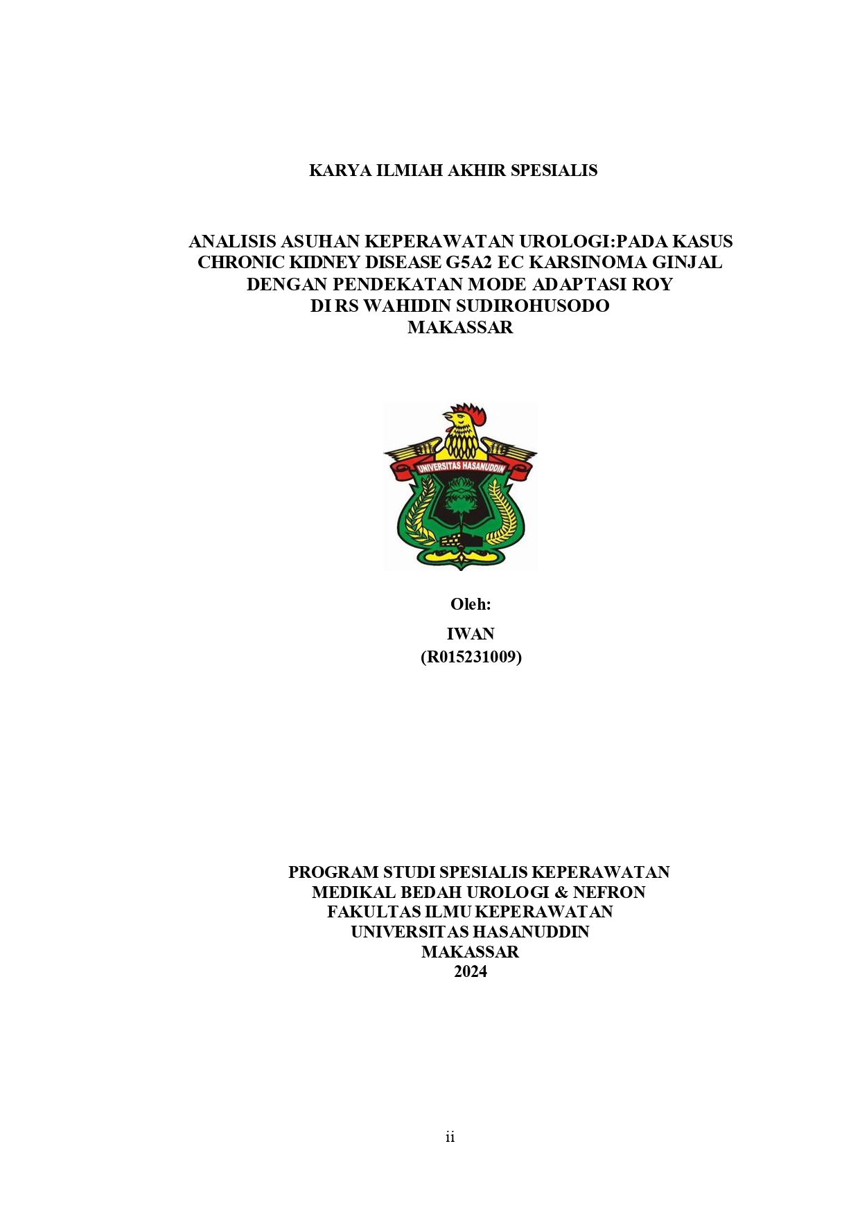 IWAN, IWAN (2025) ANALISIS ASUHAN KEPERAWATAN UROLOGI:PADA KASUS CHRONIC KIDNEY DISEASE G5A2 EC KARSINOMA GINJAL DENGAN PENDEKATAN MODE ADAPTASI ROY DI RS WAHIDIN SUDIROHUSODO MAKASSAR = ANALYSIS OF UROLOGY NURSING CARE: IN THE CASE OF CHRONIC KIDNEY DISEASE G5A2 EC KIDNEY CARCINOMA WITH ROY ADAPTATION MODE APPROACH IN WAHIDIN SUDIROHUSODO HOSPITAL MAKASSAR. Thesis thesis, Universitas Hasanuddin.