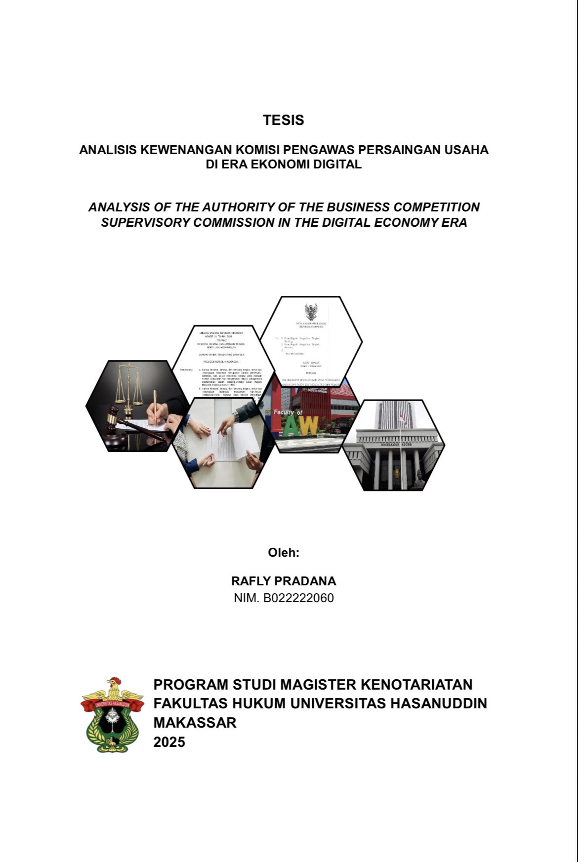 ABSTRAK RAFLY PRADANA (B022222060), “Analisis Kewenangan Komisi Pengawas Persaingan Usaha di Era Ekonomi Digital”, dibimbing oleh Muhammad Aswan. Latar Belakang, Transformasi ekonomi digital telah menciptakan struktur pasar baru yang sarat dengan tantangan hukum, terutama terkait praktik persaingan tidak sehat seperti predatory pricing dan self-preferencing oleh platform besar. KPPU mengalami kendala karena regulasi yang belum adaptif, sementara UU No. 5 Tahun 1999 belum secara eksplisit mengatur pengawasan terhadap praktik antipersaingan di ekosistem digital. Tujuan, Penelitian ini bertujuan untuk menganalisis pengaturan hukum terkait praktik persaingan usaha tidak sehat dalam pasar digital di Indonesia, serta mengevaluasi kewenangan KPPU dalam menghadapi kompleksitas pengawasan terhadap dinamika persaingan digital. Metode, Penelitian ini menggunakan metode yuridis normatif dengan pendekatan perundang- undangan. Data dikumpulkan melalui studi pustaka, analisis peraturan, putusan KPPU, dan studi kasus, lalu dianalisis secara kualitatif untuk mengidentifikasi kelemahan hukum dan merumuskan solusinya. Hasil, penelitian menunjukkan bahwa: (1) Pengaturan hukum dalam UU masih bersifat konvensional dan belum mencerminkan kebutuhan pengawasan pasar digital yang memiliki karakteristik multi-sided market, big data, dan network effect; (2) Kewenangan KPPU masih terbatas pada aspek administratif dan tidak didukung oleh kemampuan penyidikan yang kuat, serta belum memiliki infrastruktur digital yang memadai untuk mendeteksi dan menindak pelanggaran persaingan dalam platform daring. Kesimpulan, Optimalisasi kewenangan KPPU di era digital memerlukan reformulasi regulasi yang adaptif, kewenangan penyidikan terbatas, serta penguatan teknologi dan SDM penegak hukum demi mewujudkan persaingan usaha yang sehat dan adil di ekosistem digital.