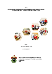 A. TENRIOLA DEPPAPADA (B022222038), Kekuatan Mengikat Surat Edaran Mahkamah Agung (Sema) dalam Kaitannya dengan Independensi Hakim. Dibimbing oleh Hamzah Halim sebagai Pembimbing. Latar Belakang: Penelitian ini membahas mengenai kekuatan mengikat Surat Edaran Mahkamah Agung (SEMA) dalam kaitannya dengan independensi hakim. SEMA, sebagai pedoman kelembagaan, memiliki fungsi strategis dalam mengisi kekosongan hukum dan menjaga keseragaman dalam praktik peradilan, meskipun tidak termasuk dalam hierarki peraturan perundang-undangan. Dalam praktiknya, SEMA sering digunakan oleh hakim sebagai rujukan dalam memutus perkara, terutama ketika undang-undang tidak memberikan solusi yang spesifik. Namun, penggunaan SEMA yang berlebihan dapat menimbulkan risiko terhadap independensi hakim, mengurangi ruang penafsiran hukum, dan menimbulkan persepsi negatif masyarakat terhadap sistem peradilan. Tujuan: (1) Untuk menganalisis kekuatan mengikatnya Surat Edaran Mahkamah Agung (SEMA) yang dijadikan rujukan oleh Hakim dalam memutus perkara di Persidangan. (2) Untuk menganalisis sanksi yang diberlakukan jika Hakim tidak patuh pada Surat Edaran Mahkamah Agung (SEMA) dalam memutus perkara serta hubungannya dengan Undang-undang Kekuasaan Kehakiman. Metode: Penelitian ini menggunakan metode penelitian hukum empiris, dengan lokasi penelitian di Pengadilan Negeri Makassar dan Pengadilan Tinggi Makassar. Data primer diperoleh melalui wawancara dengan hakim, sedangkan data sekunder diperoleh dari penelitian kepustakaan. Hasil: (1) Menunjukkan bahwa SEMA memiliki peran penting sebagai pedoman tambahan, namun penggunaannya harus tetap proporsional dan tidak menggantikan undang-undang sebagai dasar utama putusan. (2) Mahkamah Agung memiliki mekanisme pengawasan dan sanksi administratif bagi hakim yang melanggar kode etik atau pedoman perilaku hakim, namun sanksi bagi hakim yang tidak mematuhi SEMA belum ada aturan yang mengatur secara khusus, walaupun begitu karena SEMA bukanlah aturan yang sifatnya kaku sehingga tidak masalah apabila tidak digunakan sebagai dasar pertimbangan hakim, dengan catatan harus memiliki alasan lain yang logis. Kesimpulan: Merekomendasikan penguatan pelatihan, sosialisasi, dan mekanisme pengawasan untuk memastikan penggunaan SEMA tidak bertentangan dengan prinsip independensi peradilan dan prinsip-prinsip keadilan serta sanksi yang dapat diberikan efektivitasnya masih perlu ditingkatkan.
