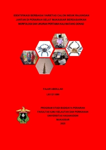 ABSTRAK FAJAR ABDILLAH. Identifikasi Berbagai Varietas Calon Induk Rajungan Jantan Di Perairan Selat Makassar Berdasarkan Morfologi Dan Ukuran Pertamakali Matang Gonad (dibimbing oleh Yushinta Fujaya). Pendahuluan. Rajungan (Portunus pelagicus) merupakan salah satu komoditas ekspor unggulan Indonesia yang memiliki nilai ekonomi tinggi. Namun, tingginya tingkat penangkapan tanpa pengelolaan yang baik menyebabkan penurunan populasi di alam. Untuk mendukung kelestarian dan program pembenihan, diperlukan pemahaman terhadap karakter morfologi dan ukuran pertama kali matang gonad sebagai dasar dalam pemilihan induk yang berkualitas. Tujuan. Penelitian ini bertujuan untuk mengidentifikasi berbagai varietas calon induk rajungan jantan berdasarkan morfologi dan ukuran pertama kali matang gonad di Perairan Makassar. Metode. Penelitian dilakukan pada bulan Desember 2024 hingga Mei 2025 di Desa Boddia, Kecamatan Galesong Selatan, Kabupaten Takalar. Sebanyak 60 ekor rajungan jantan diamati dengan parameter meliputi corak karapas, bentuk dan ukuran gonopod, panjang serta jumlah segmen antena, dan tingkat kematangan gonad (TKG), Data dianalisis secara deskriptif dan statistik menggunakan Microsoft Excel. Hasil. Penelitian ini menunjukkan adanya perbedaan signifikan antar corak. Corak 2 didominasi individu dengan ukuran tubuh lebih besar, tingkat kematangan gonad lebih tinggi (TKG II–III), dan rasio panjang antena terhadap lebar karapas yang lebih besar. Rajungan dengan gonopod berbentuk memanjang memiliki antena yang lebih panjang, sementara yang berbentuk melebar memiliki jumlah segmen lebih banyak. Ukuran pertama kali matang gonad ditemukan pada lebar karapas 99 mm. Kesimpulan. Penelitian ini menunjukkan bahwa karakter morfologi tertentu dapat digunakan sebagai indikator dalam seleksi induk jantan, sehingga mendukung upaya budidaya dan konservasi rajungan secara berkelanjutan.
