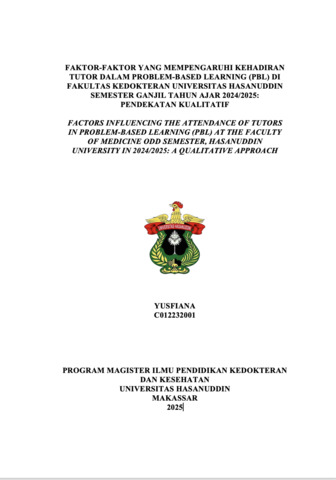 YUSFIANA, YUSFIANA (2025) FAKTOR-FAKTOR YANG MEMPENGARUHI KEHADIRAN TUTOR DALAM PROBLEM-BASED LEARNING (PBL) DI FAKULTAS KEDOKTERAN UNIVERSITAS HASANUDDIN SEMESTER GANJIL TAHUN AJAR 2024/2025: PENDEKATAN KUALITATIF = FACTORS INFLUENCING THE ATTENDANCE OF TUTORS IN PROBLEM-BASED LEARNING (PBL) AT THE FACULTY OF MEDICINE ODD SEMESTER, HASANUDDIN UNIVERSITY IN 2024/2025: A QUALITATIVE APPROACH. Thesis thesis, Universitas Hasanuddin.
