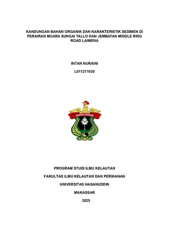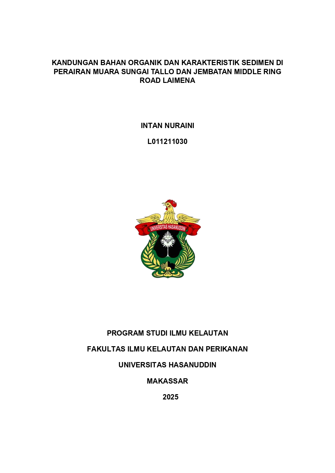 NURAINI, INTAN (2025) Kandungan Bahan Organik dan Karakteristik Sedimen di Perairan Muara Sungai Tallo dan Jembatan Middle Ring Road Laimena = Organic Material Content and Sediment Characteristics in the Tallo River Estuary and the Laimena Middle Ring Road Bridge. Skripsi thesis, Universitas Hasanuddin.