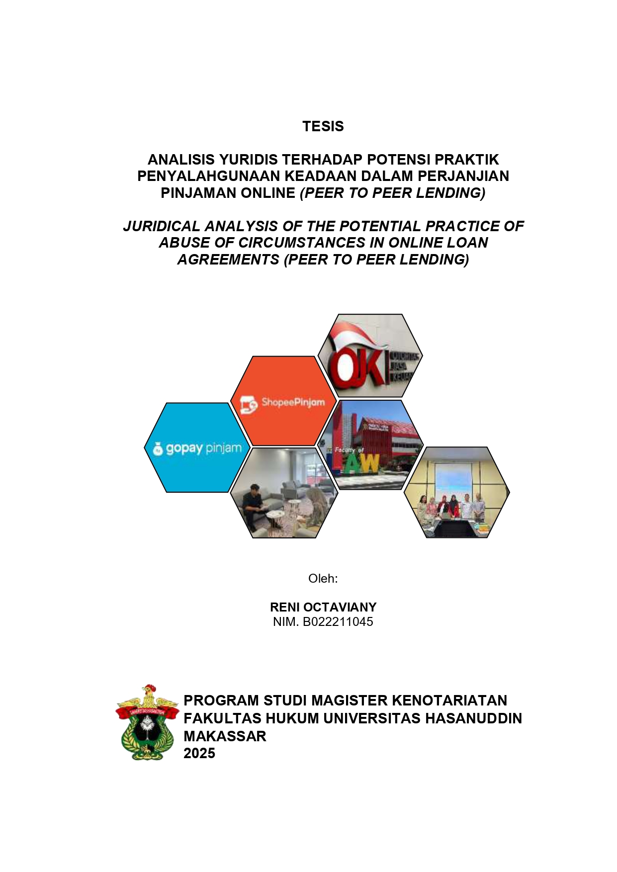 RENI OCTAVIANY (B022211045). Analisis Yuridis terhadap Potensi Praktik Penyalahgunaan Keadaan dalam Perjanjian Pinjaman Online (Peer to Peer Lending). Dibimbing oleh Maskun dan Aulia Rifai. Penelitian ini bertujuan untuk menganalisis dan mengidentifikasi keabsahan perjanjian yang dibuat antara peminjam dan pemberi pinjaman online dalam transaksi pinjaman online (peer to peer lending) dan menganalisis seberapa potensial terjadinya penyalahgunaan keadaan dalam perjanjian pinjaman online. Penelitian ini adalah penelitian normatif. Pendekatan yang dipake adalah pendekatan perundang-undangan dan konseptual, jenis dan sumber bahan hukum primer dan sekunder, di kumpulkan melalui studi pustaka dan di analisis secara kualitatif melalui putusan. Hasil dari penelitian ini menunjukkan bahwa (1) Keabsahan perjanjian pinjaman online diatur oleh BW dan OJK. Syarat-syarat tersebut mencakup kesepakatan yang sah antara para pihak yang terlibat dengan iktikad baik, kecakapan hukum para pihak, kejelasan objek perjanjian, serta sebab yang halal. Perjanjian harus menghindari klausul sepihak yang merugikan, seperti perubahan tanggal jatuh tempo tanpa persetujuan maupun bunga yang tidak wajar. Untuk memastikan keabsahan, penting adanya integritas, transparansi, keadilan dan kejujuran dalam perjanjian. Jika tidak ada permohonan pembatalan, perjanjian tetap sah dan para pihak wajib mematuhinya (2) Terdapat potensi penyalahgunaan keadaan dalam perjanjian pinjaman online yang terjadi antara peminjam dengan penyelenggara pinjaman online sebagaimana yang terjadi pada Shopee Pinjam dan GoPay Pinjam karena adanya klausul yang tidak adil seperti denda keterlambatan yang tidak proporsional, perubahan syarat dan ketentuan di kemudian hari dan pembatasan tanggung jawab penyelenggara yang tidak proporsional.