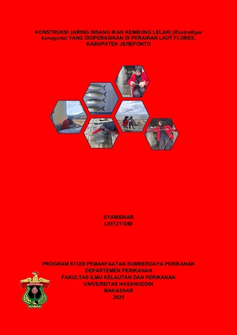 ABSTRAK SYAMSINAR, L051211088. Konstruksi Jaring Insang Ikan Kembung Lelaki (Rastrelliger kanagurta) yang dioperasikan di Perairan Laut Flores, Kabupaten Jeneponto (Mahfud Palo). Latar belakang. Salah satu alat tangkap yang beroperasi di Perairan Laut Flores, Kabupaten Jeneponto adalah jaring insang. Tujuan. Penelitian ini bertujuan untuk mendeskripsikan konstruksi jaring insang Ikan kembung yang digunakan oleh nelayan di perairan Kabupaten Jeneponto, serta dapat mendeskripsikan jenis ikan kembung yang tertangkap di perairan Kabupaten Jeneponto. Metode. Metode yang digunakan dalam penelitian ini adalah studi kasus pada alat tangkap jaring insang ikan kembung dimana metode ini digunakan untuk mengetahui konstruksi dari alat tangkap tersebut. Pengambilan data dilakukan dengan cara mengikuti pengoperasian penangkapan jaring insang secara langsung untuk mengetahui jenis ikan kembung yang tertangkap, melakukan wawancara dengan nelayan mengenai konstruksi jaring insang, serta mengambil satu unit jaring insang untuk melakukan pengukuran terhadap setiap komponen- komponen dan bagian dari alat tangkap tersebut. Hasil. Jaring insang ikan kembung yang dioperasikan di perairan Kabupaten Jeneponto memiliki konstruksi yakni terdiri dari 52 buah pelampung dengan jarak antar pelampung 85 cm, jumlah mata antar pelampung 35 mata, jumlah pemberat 455 buah dengan jarak antar pemberat 10 cm, jumlah mata antar pemberat 4 mata, panjang tali ris atas 43 m dan tali ris bawah 45 m yang terbuat dari bahan polyethlene, panjang badan jaring 43 m dan lebar 1,2 m, jumlah mata jaring keseluruhan 1820 mata. Nilai shortening bagian atas jaring 37,5%, sedangkan bagian bawah jaring 34,5%, kedalaman jaring mencapai 1,04 m, memiliki gaya apung sebesar 0,4596 kgf, sedangkan gaya tenggelamnya mencapai 0.462 kgf. Kesimpulan. Kesimpulan penelitian ini menunjukan bahwa hasil tangkapan utama jaring insang adalah ikan kembung lelaki (Rastrelliger kanagurta).