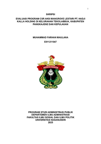 MAULANA, MUHAMMAD FARHAN (2025) EVALUASI PROGRAM CSR AKSI MANGROVE LESTARI PT. HADJI KALLA HOLDING DI KECAMATAN TEKOLABBUA, KABUPATEN PANGKAJENE DAN KEPUALAUAN = EVALUATION OF THE CSR PROGRAM AKSI MANGROVE LESTARI BY PT. HADJI KALLA HOLDING IN TEKOLABBUA URBAN VILLAGE, PANGKAJENE AND ISLAND REGENCY. Skripsi thesis, Universitas Hasanuddin.