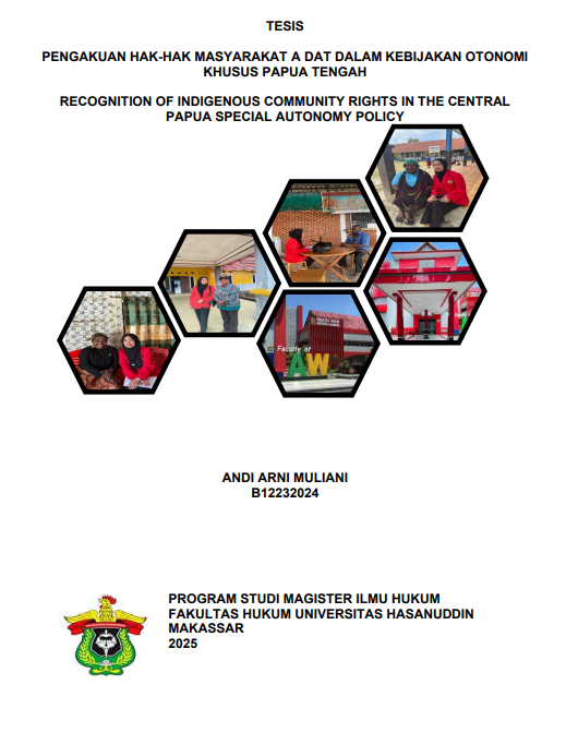 MULIANI, ANDI ARNI (2025) PENGAKUAN HAK-HAK MASYARAKAT A DAT DALAM KEBIJAKAN OTONOMI KHUSUS PAPUA TENGAH = RECOGNITION OF INDIGENOUS COMMUNITY RIGHTS IN THE CENTRAL PAPUA SPECIAL AUTONOMY POLICY. Thesis thesis, UNIVERSITAS HASANUDDIN.