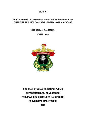 RAHMAH S., NUR AFNIAH (2025) Public Value dalam Penerapan QRIS sebagai Inovasi Financial Technology Pada UMKM di Kota Makassar = Public Value in the Implementation of QRIS as a Financial Technology Innovation for MSMEs in Makassar City. Skripsi thesis, Universitas Hasanuddin.