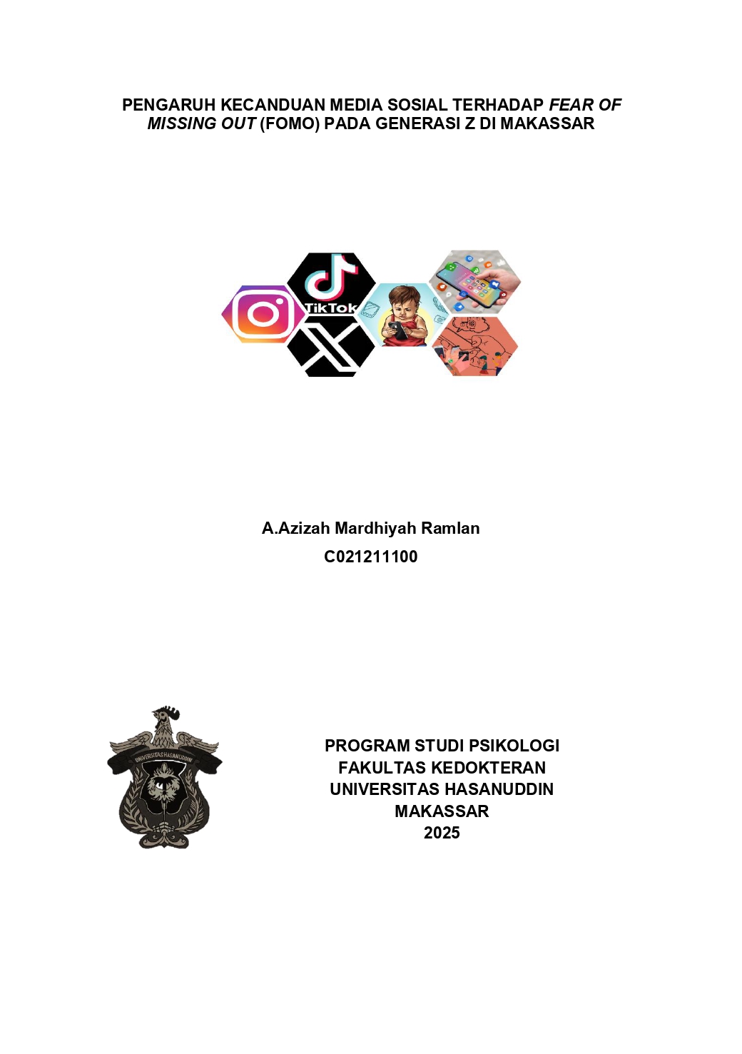 RAMLAN, A. AZIZAH MARDHIYAH (2025) PENGARUH KECANDUAN MEDIA SOSIAL TERHADAP FEAR OF MISSING OUT (FOMO) PADA GENERASI Z DI MAKASSAR = The Effect of Social Media Addiction on Fear of Missing Out (FoMO) in Generation Z in Makassar. Skripsi thesis, Universitas Hasanuddin.