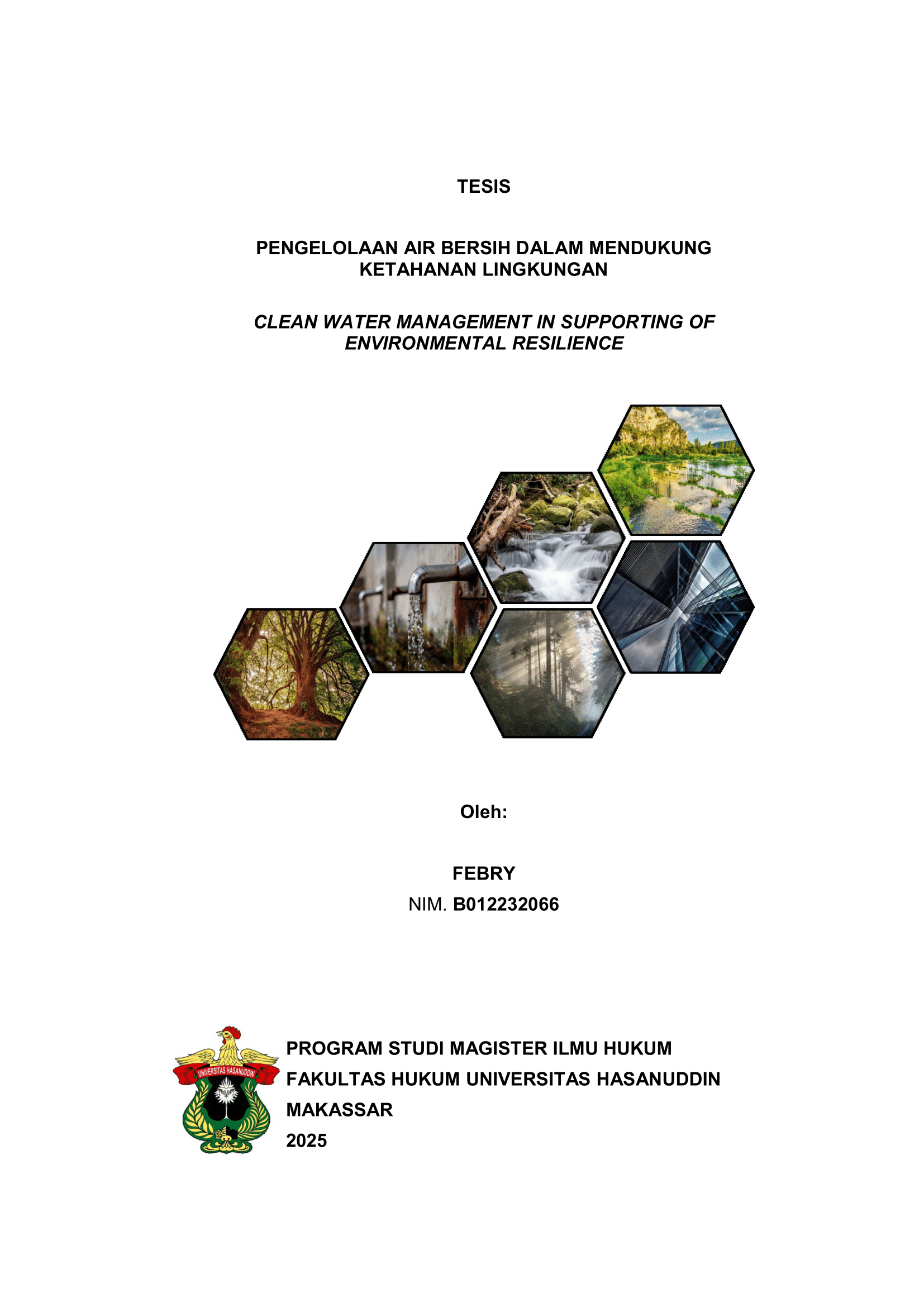FEBRY (B012232066). Pengelolaan air bersih dalam mendukung ketahanan lingkungan. Dibimbing oleh Andi Syahwiah A. Sapiddin. Latar Belakang: Fakta di lapangan menunjukkan bahwa akses ketersediaan air bersih menghadapi banyak tantangan. Hal ini berdampak pada keberlangsungan hidup manusia dengan berkurangnya ketersediaan air bersih. Metode: Penelitian menggunakan tipe penelitian hukum normatif melalui pendekatan perundang-undangan dan konseptual. Bahan hukum primer meliputi UUD NRI Tahun 1945, Undang-Undang Nomor 17 Tahun 2019 tentang Sumber Daya Air, serta berbagai peraturan perundang-undangan lain. Bahan hukum sekunder meliputi buku dan jurnal hukum. Analisis yang digunakan adalah analisis kualitatif deskriptif. Hasil: (1) Penelitian ini menunjukkan bahwa pengelolaan air bersih masih dihadapkan pada tantangan kelembagaan yang belum teratasi, terutama terkait pembagian kewenangan antara pemerintah pusat dan daerah yang belum sepenuhnya harmonis. Dominasi pendekatan efisiensi ekonomi melalui kemitraan dengan pihak swasta menyebabkan lemahnya mekanisme pengawasan dan keterlibatan publik, sehingga belum mendukung tata kelola air yang inklusif dan berkelanjutan; (2) Tekanan terhadap sumber daya air meningkat akibat perubahan iklim dan ketimpangan daya tanggap antarwilayah, sehingga konservasi menjadi kebutuhan strategis. Regulasi telah mengatur prinsip konservasi, namun pelaksanaannya masih terhambat oleh persoalan teknis, koordinasi, dan anggaran. Kesimpulan: (1) Pengelolaan air bersih masih menghadapi tantangan kelembagaan yang kompleks, terutama terkait ketidaksinkronan pembagian kewenangan dan kecenderungan privatisasi yang melemahkan pengawasan dan keterlibatan publik; (2) konservasi air bersih menjadi semakin penting di tengah tekanan perubahan iklim dan ketimpangan daya tanggap, yang menuntut penguatan koordinasi, kapasitas kelembagaan, serta keberpihakan terhadap kelompok rentan dalam kerangka hukum yang menjamin akses berkelanjutan.