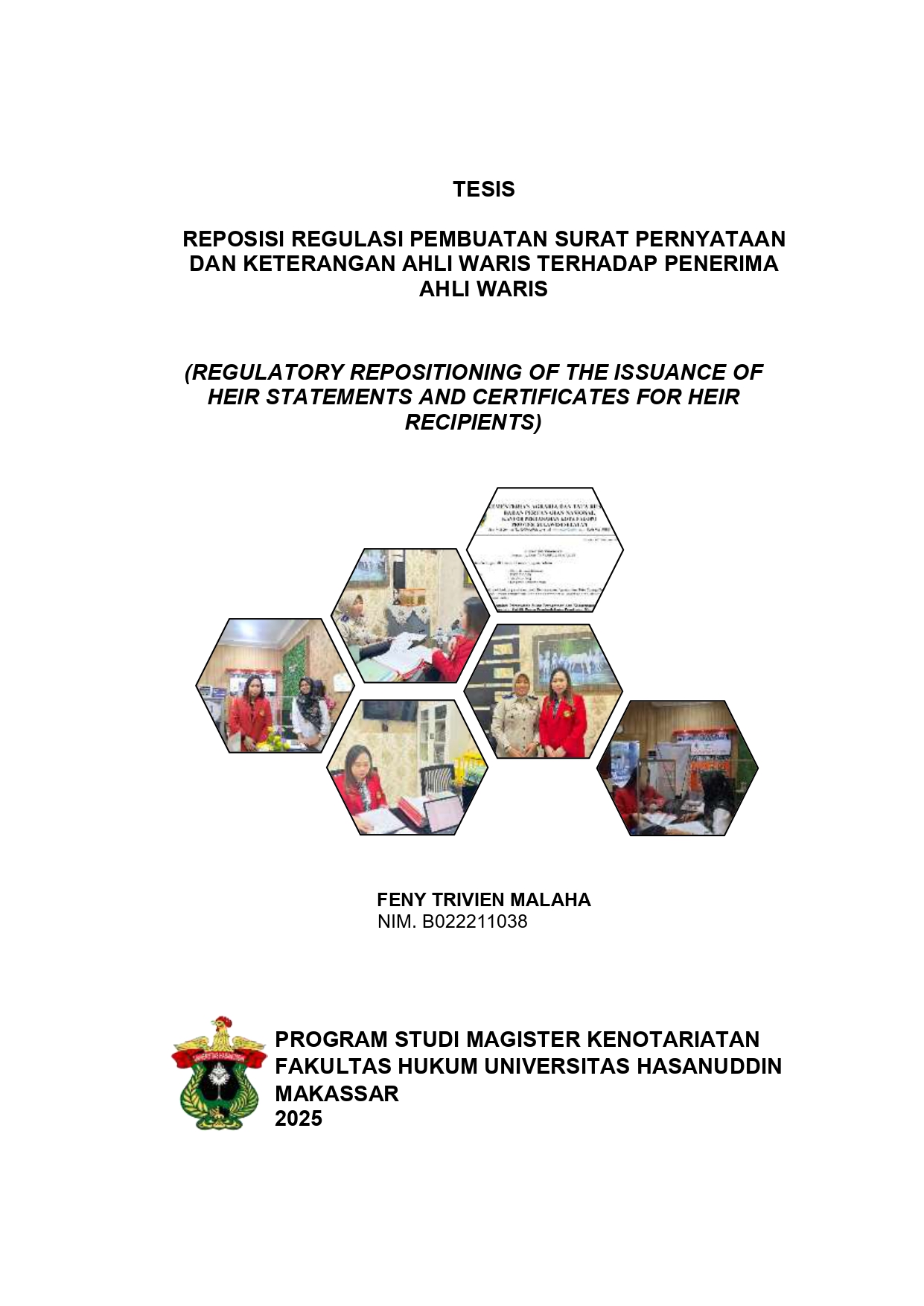 MALAHA, FENY TRIVIEN (2025) REPOSISI REGULASI PEMBUATAN SURAT PERNYATAAN DAN KETERANGAN AHLI WARIS TERHADAP PENERIMA AHLI WARIS = REGULATORY REPOSITIONING OF THE ISSUANCE OF HEIR STATEMENTS AND CERTIFICATES FOR HEIR RECIPIENTS. Thesis thesis, UNIVERSITAS HASANUDDIN.