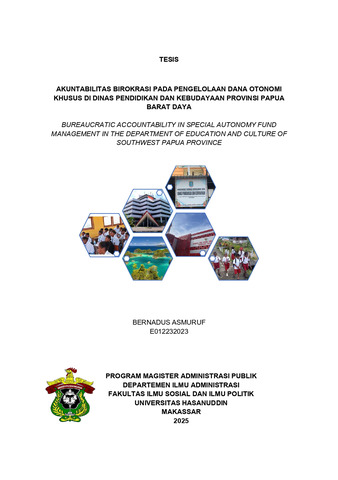 ASMURUF, BERNADUS (2025) AKUNTABILITAS BIROKRASI PADA PENGELOLAAN DANA OTONOMI KHUSUS DI DINAS PENDIDIKAN DAN KEBUDAYAAN PROVINSI PAPUA BARAT DAYA = BUREAUCRATIC ACCOUNTABILITY IN SPECIAL AUTONOMY FUND MANAGEMENT IN THE DEPARTMENT OF EDUCATION AND CULTURE OF SOUTHWEST PAPUA PROVINCE. Thesis thesis, Universitas Hasanuddin.