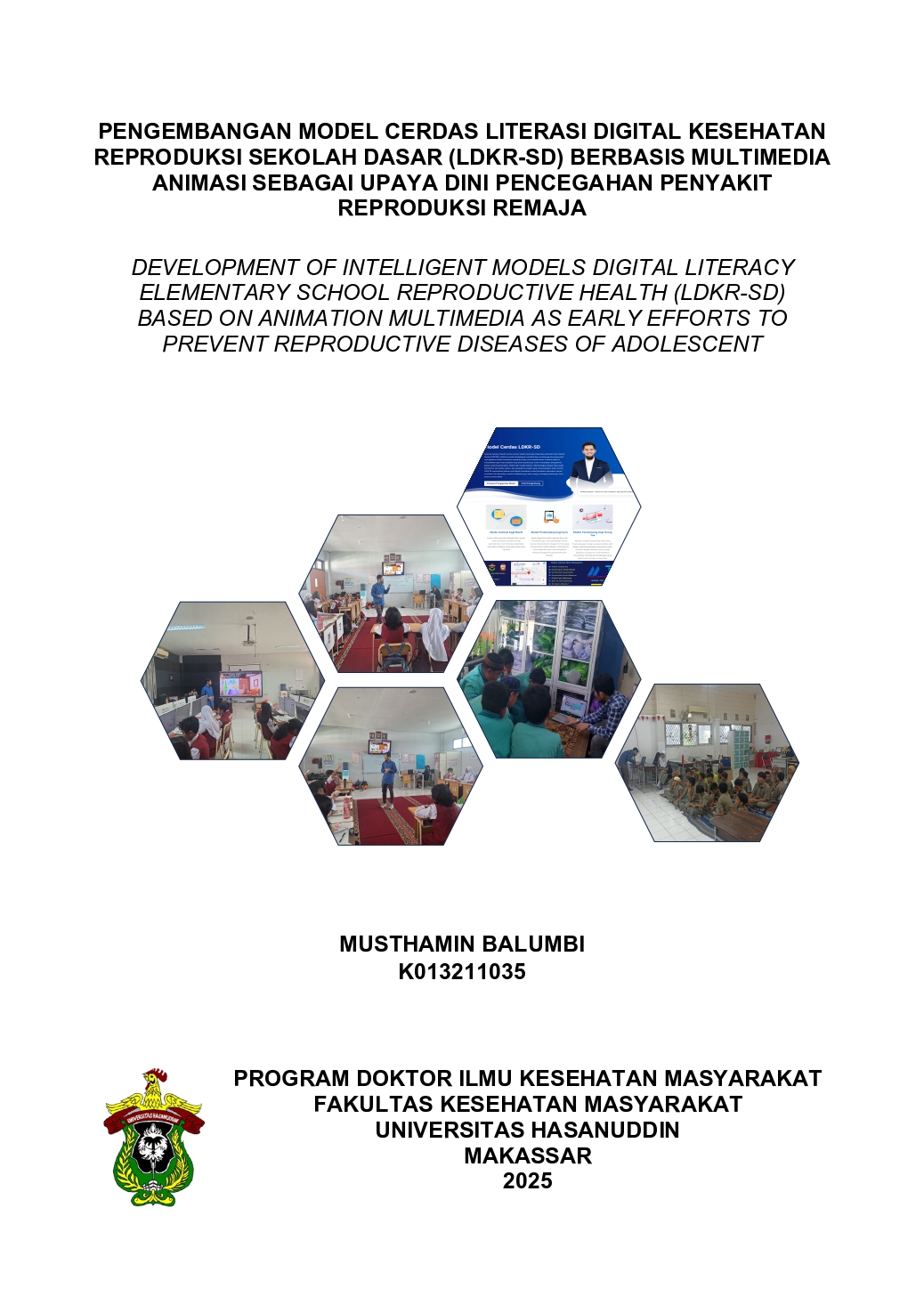 MUSTHAMIN BALUMBI. Pengembangan Model Cerdas Literasi Digital Kesehatan Reproduksi Sekolah Dasar (LDKR-SD) Berbasis Multimedia Animasi sebagai Upaya Dini Pencegahan Penyakit Reproduksi Remaja (dibimbing oleh Stang, Suriah, dan Syafruddin Syarif). Latar Belakang. Kesehatan reproduksi remaja di Indonesia sangat memprihatinkan akibat kurangnya literasi dan edukasi yang tepat. Penelitian ini mengembangkan model cerdas literasi digital kesehatan reproduksi sekolah dasar (LDKR-SD) berbasis multimedia animasi untuk meningkatkan pengetahuan, persepsi, sikap, dan perilaku murid SD sebagai salah satu upaya mencegah penyakit reproduksi ketika mereka remaja nanti, dengan dukungan guru dan orang tua. Tujuan. Penelitian ini bertujuan mengembangkan model cerdas LDKR-SD berbasis multimedia animasi, menganalisis proses pengembangannya, serta mengevaluasi pengaruh model tersebut terhadap peningkatan pengetahuan, persepsi, sikap, dan perilaku murid SD. Metode. Penelitian ini menggunakan metode kombinasi (mixed method) dengan strategi eksploratoris sekuensial, meliputi dua tahapan utama. Tahap pertama menggunakan pendekatan kualitatif untuk mengeksplorasi fenomena, merancang, dan mengembangkan model cerdas LDKR-SD berbasis multimedia animasi. Tahap kedua menggunakan pendekatan kuantitatif untuk mengevaluasi pengaruh model terhadap pengetahuan, persepsi, sikap, dan perilaku murid SD terkait kesehatan reproduksi. Hasil. Hasil penelitian tahap I mengungkap bahwa literasi kesehatan reproduksi di sekolah dasar sangat penting untuk membangun pemahaman dan sikap positif terhadap pertumbuhan fisik serta mencegah perilaku berisiko, meskipun menghadapi tantangan kurangnya materi terintegrasi dan hambatan sosial budaya. Model cerdas LDKR-SD berbasis multimedia animasi dikembangkan melalui pembuatan situs web dengan chatbot, media animasi interaktif, game edukasi, modul pendamping, dan QR code untuk akses mudah. Hasil validasi oleh ahli media, ahli materi, dan guru yang berkisar antara 93,3% - 100%, menunjukkan model ini sangat layak digunakan, dengan penerimaan tinggi (100%) pada aspek kebergunaan, kemudahan, dan niat penggunaan berdasarkan uji TAM, sehingga direkomendasikan untuk diterapkan secara luas. Penelitian tahap II menunjukkan bahwa model cerdas LDKR-SD berbasis multimedia animasi lebih efektif dibandingkan metode konvensional dengan video PJOK di kanal YouTube e-Pjok dalam meningkatkan pengetahuan, persepsi, sikap, dan perilaku murid SD tentang kesehatan reproduksi. Kesimpulan. Model cerdas LDKR-SD berbasis multimedia animasi berhasil dikembangkan dengan pendekatan kolaboratif yang melibatkan murid, guru, dan orang tua, serta menggunakan teknologi inovatif seperti animasi, game edukasi, modul digital, chatbot, dan QR code. Model ini telah divalidasi dengan hasil sangat baik dan diterima dengan baik oleh pengguna, dengan tingkat penerimaan 100%. Model ini efektif meningkatkan literasi digital kesehatan reproduksi, mengubah persepsi negatif menjadi positif, serta mempromosikan kolaborasi antara murid, guru, dan orang tua. Selain itu, model ini terbukti lebih efektif dibandingkan metode konvensional dalam meningkatkan pengetahuan, sikap, dan perilaku murid, serta berpotensi untuk diterapkan lebih luas.