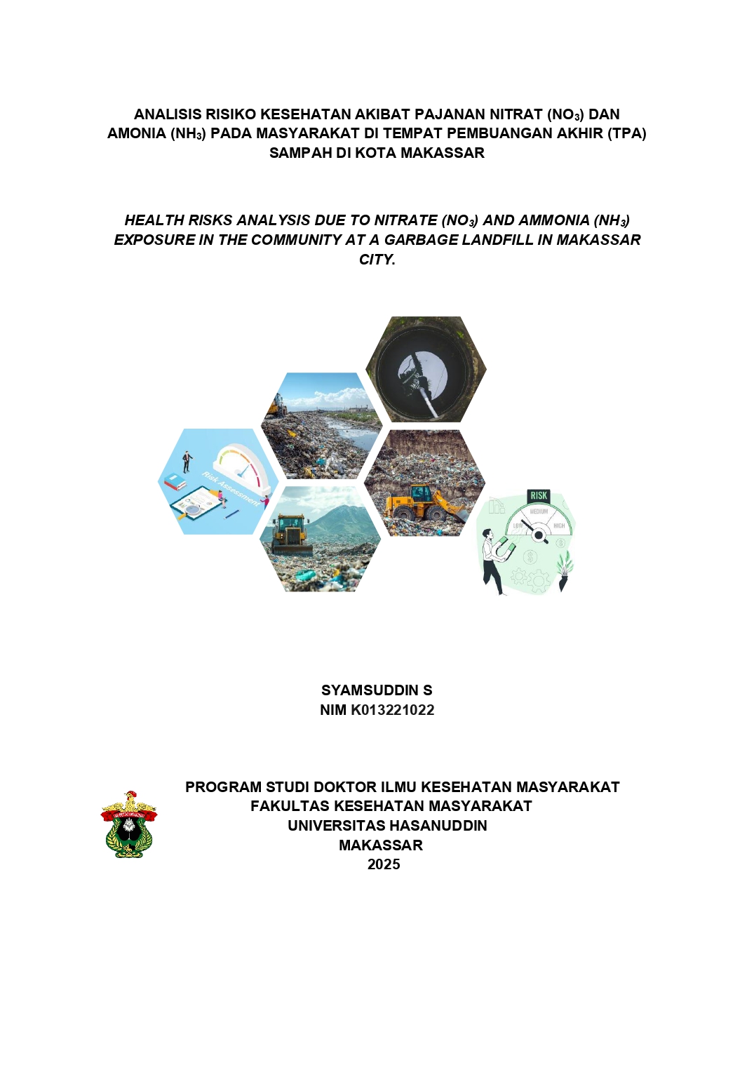 Syamsuddin S. Risiko Kesehatan Akibat Paparan Nitrat (NO3) dan Amonia (NH3) pada Masyarakat Lokal Pembuangan Akhir Sampah di Kota Makassar ( Dibimbing oleh : Anwar Daud, Anwar Mallongi , Atjo Wahyu , Ridwan Amiruddin , Wahiduddin , Agus Bintara Birawida ) Latar belakang. Tempat Pembuangan Akhir (TPA) Tamangapa di Kota Makassar berpotensi mencemari lingkungan, termasuk sumber air masyarakat sekitar, dengan senyawa berbahaya seperti nitrat dan amonia. Paparan senyawa ini melalui air sumur yang digunakan untuk kebutuhan sehari-hari dapat menimbulkan risiko kesehatan yang signifikan. Tujuan. Penelitian ini bertujuan untuk mengevaluasi risiko kesehatan akibat paparan nitrat dan amonia pada masyarakat yang tinggal di sekitar TPA Tamangapa, khususnya dari air sumur yang digunakan sebagai sumber air minum. Metode. Penelitian menggunakan desain potong lintang dengan pendekatan analisis risiko kesehatan lingkungan. Pengumpulan data dilakukan melalui pengukuran konsentrasi nitrat dan amonia pada 38 sampel air sumur, serta wawancara terhadap 76 responden yang dipilih menggunakan purposive sampling, yakni warga sekitar TPA yang mengandalkan air sumur untuk kebutuhan harian. Hasil. Hasil analisis menunjukkan bahwa 27 dari 38 sampel air sumur mengandung nitrat melebihi batas aman, sementara 20 sampel menunjukkan kandungan amonia yang juga melebihi ambang batas. Analisis Target Hazard Quotient (THQ) menunjukkan nilai THQ > 1 pada kelompok dewasa, yang mengindikasikan adanya risiko kesehatan yang signifikan. Risiko ini diproyeksikan meningkat dalam jangka panjang, terutama dengan frekuensi paparan yang tinggi. Kesimpulan. Paparan nitrat dan amonia melalui konsumsi air sumur di sekitar TPA Tamangapa memberikan ancaman kesehatan serius bagi masyarakat, terutama anak-anak dan orang dewasa. Oleh karena itu, diperlukan strategi manajemen risiko berupa pemantauan kualitas air, edukasi masyarakat, serta penerapan teknologi pengolahan air yang memadai. Temuan ini menegaskan pentingnya kebijakan pengelolaan sampah yang lebih ketat untuk melindungi kesehatan masyarakat..