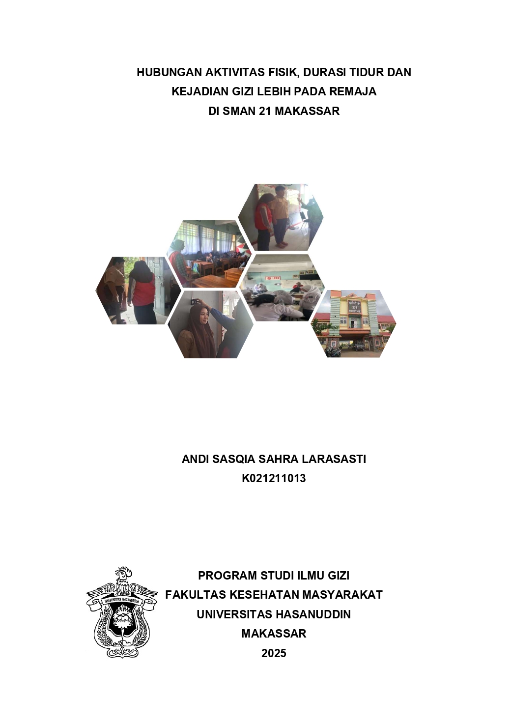 LARASASTI, ANDI SASQIA SAHRA (2025) Hubungan Aktivitas Fisik, Durasi Tidur, dan Kejadian Gizi Lebih pada Remaja di SMAN 21 Makassar = The Relationship between Physical Activity, Sleep Duration, and The Incident of Overnutrition among Adolescents at SMAN 21 Makassar. Skripsi thesis, UNIVERSITAS HASANUDDIN MAKASSAR.