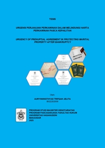 AURYNNINGTHYAS TRIFQAH JELITA (B022202006), Urgensi Perjanjian Perkawinan dalam melindungi harta perkawinan pasca kepailitan (dibimbing oleh Musakkir dan Marwah ) Penelitian ini bertujuan untuk menganalisis akibat hukum perjanjian perkawinan yang terlambat didaftarkan terhadap pihak ketiga dan mengetahui akibat perjanjian perkawinan yang terlambat didaftarkan yang berlaku surut terhadap harta bersama dalam kepailitan suami atau isteri.Penelitian ini menggunakan tipe penelitian normatif, yaitu penelitian untuk menguji suatu norma atau ketentuan yang berlaku yang didukung dan dilengkapi dengan data empiris. Sumber data diperoleh melalui sumber bahan hukum primer dan sekunder. Penelitian ini selanjutnya dianalisis data selesai, hasilnya disajikan secara deskriptif. Hasil penelitian menunjukkan bahwa (1)keterlambatan pendaftaran perjanjian kawin membuat harta bersama dapat dikategorikan sebagai harta yang masuk dalam boedel pailit atau sita umum, berbeda dengan perjanjian kawin yang tidak didaftarkan atau terlambat didaftarkan kepada pihak ketiga, hanya berlaku bagi para pihak yang terlibat didalam akta, maka perlunya memperketat pendaftaran setelah pembuatan perjanjian perkawinan, (2) jika perjanjian kawin telah didaftarkan kepada pihak ketiga, maka harta isteri dari suami yang pailit dapat dilindungi dengan perlindungan hukum represif diterapkan ketika sengketa sudah terjadi. Disarankan perjanjian kawin memuat klausul- klausul yang akan memberikan perlindungan hukum bagi harta bersama.