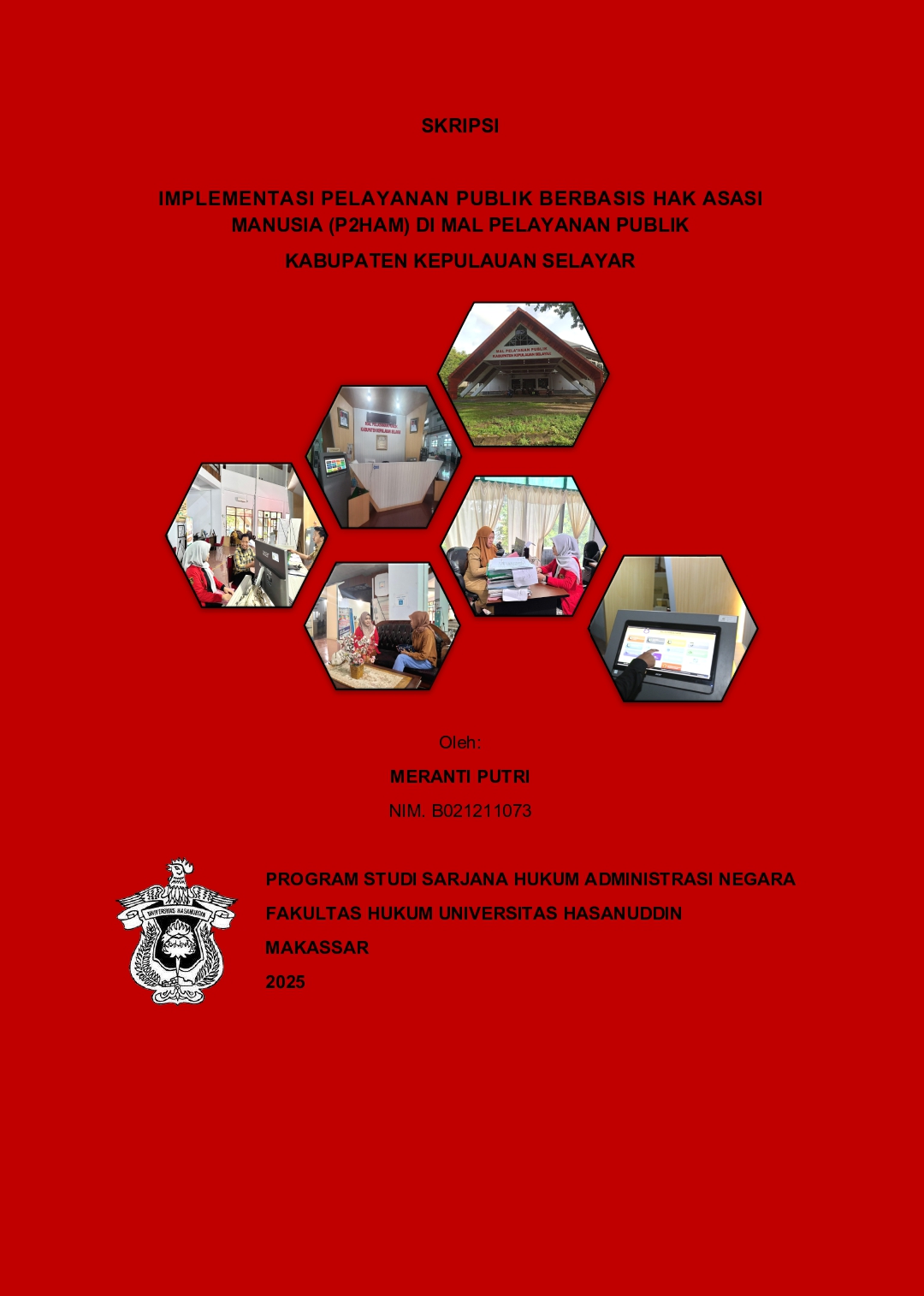 Meranti Putri (B021211073). Implementasi Pelayanan Publik Berbasis Hak Asasi Manusia (P2HAM) di Mal Pelayanan Publik Kabupaten Kepulauan Selayar. (Dibimbing oleh Arini Nur Annisa) sebagai Pembimbing. Latar Belakang: Pelayanan publik yang diskriminatif, birokratis, akuntabilitas yang rendah serta sarana prasarana, fasilitas, dan aksebilitas yang tidak memadai bertentangan dengan prinsip Hak Asasi Manusia. Padahal, pelayanan publik yang baik seharusnya berlandaskan asas kesamaan hak dan persamaan perlakuan/tidak diskriminatif. Tujuan: penelitian ini adalah untuk mengetahui implementasi pelayanan publik berbasis hak asasi manusia terhadap pelayanan perizinan usaha dan faktor-faktor yang mempengaruhi implementasi dalam pelayanan publik berbasis hak asasi manusia terhadap pelayanan perizinan usaha di Mal Pelayanan Publik Kabupaten Kepulauan Selayar. Metode: penelitian yang digunakan adalah empiris. Jenis dan sumber data yaitu data primer yang diperoleh melalui wawancara dan data sekunder dari peraturan perundang-undangan, buku, jurnal, buku-buku hukum, karya ilmiah, kamus, ensiklopedi, dan dokumen-dokumen yang berkaitan dengan permasalahan penelitian yang bersumber dari bahan kepustakaan. Bahan hukum tersebut diolah dan dianalisis secara deskriptif kualitatif. Hasil penelitian menunjukkan bahwa implementasi pelayanan publik berbasis Hak Asasi Manusia dalam pelayanan perizinan usaha di Mal Pelayanan Publik Kabupaten Kepulauan Selayar telah berjalan sesuai asas kesamaan hak dan prinsip non-diskriminasi, namun pelaksanaannya belum optimal. Faktor pendukung implementasi meliputi tersedianya aksesibilitas seperti maklumat pelayanan, mekanisme pengaduan, layanan bagi kelompok rentan, serta fasilitas jalan landai. Sementara itu, faktor penghambat mencakup belum tersedianya lantai pemandu, alat bantu dengar, tongkat bantu, ruang laktasi yang nyaman, tempat bermain anak, dan petugas khusus untuk kelompok rentan akibat keterbatasan anggaran. Kesimpulan: Dengan demikian, hambatan-hambatan tersebut menjadi kendala utama dalam optimalisasi pelayanan berbasis HAM.