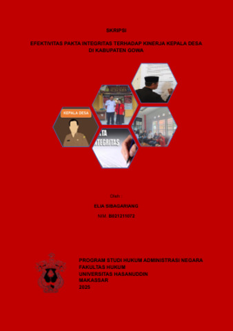 ABSTRAK ELIA SIBAGARIANG (B021211072). Efektivitas Pakta Integritas Terhadap Kinerja Kepala Desa di Kabupaten Gowa. Dibimbing oleh Muhammad Zulfan Hakim sebagai pembimbing. Latar Belakang: Meskipun pemerintahan Indonesia telah menerapkan berbagai kebijakan dalam pemberantasan korupsi salah satunya penerapan pakta integritas. Namun, praktik korupsi masih marak terjadi, khususnya ditingkat desa seperti yang terjadi di kabupaten Gowa. Tujuan: Penelitian ini bertujuan untuk mengetahui sejauh mana efektivitas pakta integritas dan apa saja faktor penghambat serta faktor pendukung pakta integritas terhadap kinerja kepala desa di Kabupaten Gowa. Metode: Penelitian ini menerapkan metode penelitian hukum empiris dengan pendekatan kualitatif melalui wawancara serta telaah regulasi yang dianalisis secara deskriptif. Hasil: Penelitian menunjukkan bahwa (1) efektifitas penerapan pakta integritas kepala desa di kabupaten Gowa melalui perspektif teori efektivitas hukum dari Lawrence M. Friedman belum sepenuhnya efektif. Secara struktur hukum, lemahnya keterlibatan aparat penegak hukum. Dari sisi substansi hukum aturan telah memadai namun berbenturan dengan prinsip otonomi desa. Sementara itu, secara budaya hukum, kepatuhan terhadap pakta integritas masih bersifat formalitas. (2) faktor pendukung penerapan pakta integritas yaitu komitmen kepala desa, peraturan perundang-undangan, partisipasi masyarakat, musyawarah desa dan penerapan sanksi. Sedangkan, faktor penghambat yaitu sanksi yang kurang tegas, kurangnya kesadaran masyarakat, rendahnya kompetensi kepala desa, kepentingan kelompok dan pengaruh sosial di masyarakat. Kesimpulan : Penerapan pakta integritas kepala desa di Kabupaten Gowa belum sepenuhnya efektif, kendalanya ada pada lemahnya penegakan hukum, benturan dengan prinsip otonomi dan kepatuhan yang masih bersifat formalitas.
