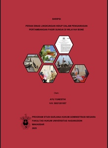 ABSTRAK AYU YUNESTHI (B021201057). Peran Dinas Lingkungan Hidup dalam Pengawasan Penambangan Pasir Sungai di Wilayah Bone. Dibimbing oleh Ariani Arifin sebagai Supervisor. Latar Belakang : Maraknya pertambangan pasir sungai yang dilakukan secara ilegal yang menimbulkan dampak negatif terhadap lingkungan yang dirasakan langsung oleh masyarakat yang tinggal disekitar lokasi pertambangan sehingga perlu adanya pengawasan. Tujuan : Penelitian ini bertujuan untuk menganalisis pelaksanaan fungsi pengawasan yang dilakukan oleh Dinas Lingkungan Hidup terhadap pertambangan pasir sungai di Wilayah Bone Utara dan menganalisis faktor yang menjadi kendala pelaksanaan pengawasan oleh Dinas Lingkungan Hidup terhadap pertambangan pasir sungai di Wilayah Bone Utara. Metode : Penelitian yang digunakan merupakan jenis penelitian hukum Empiris, dengan menggunakan sumber data primer yang diperoleh melalui wawancara dan data sekunder yang diperoleh dari berbagai literatur seperti peraturan perundang-undangan, buku-buku yang relevan dengan penelitian, hasil penelitian yang berwujud skripsi dan jurnal-jurnal yang berkaitan dengan penelitian. Hasil : Penelitian menunjukkan bahwa 1) Dinas Lingkungan Hidup melakukan pengawasan terhadap pertambangan pasir sungai di Wilayah Bone Utara dalam bentuk menidaklanjuti aduan yang masuk dengan turun ke lapangan melakukan pembinaan dalam bentuk himbauan untuk segera berhenti melakukan pengambilan pasir dan menyarankan untuk mengurus izinnya terlebih dahulu setelah itu boleh melanjutkan serta menjelaskan kepada pelaku usaha mengenai prosedur dan mekanisme untuk mengurus izin usaha pertambangan. 2) Faktor yang menjadi kendala pelaksanaan pengawasan oleh Dinas Lingkungan Hidup terhadap pertambangan pasir sungai di Wilayah Bone Utara meliputi faktor hukumnya sendiri, faktor penegak hukum, faktor sarana dan fasilitas, faktor Masyarakat, serta faktor Kebiasaan. Kesimpulan : Pelaksanaaan fungsi pengawasan yang dilakukan oleh Dinas Lingkungan Hidup terhadap pertambangan pasir sungai di Wilayah Bone Utara belum optimal dan kurang efektif dikarenakan adanya batasan kewenangan terhadap perizinan serta pengawasan pertambangan dari Pemerintah Daerah yang beralih ke Pemerintah Pusat atau sentralisasi sehingga Dinas Lingkungan Hidup hanya melakukan pengawasan jika ada aduan masuk terkait adanya pertambangan pasir yang ada di wilayahnya dengan cara menindaklanjuti aduan yang masuk dengan turun ke lokasi dan melaporkan hasil tindak lanjutnya serta berkoordinasi ke Dinas Provinsi dan kementrian yang memiliki kewenangan penuh.