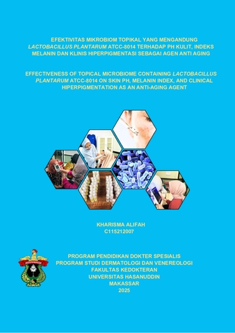 ALIFAH, KHARISMA (2025) EFEKTIVITAS MIKROBIOM TOPIKAL YANG MENGANDUNG LACTOBACILLUS PLANTARUM ATCC-8014 TERHADAP PH KULIT, INDEKS MELANIN DAN KLINIS HIPERPIGMENTASI SEBAGAI AGEN ANTI AGING = EFFECTIVENESS OF TOPICAL MICROBIOME CONTAINING LACTOBACILLUS PLANTARUM ATCC-8014 ON SKIN PH, MELANIN INDEX, AND CLINICAL HIPERPIGMENTATION AS AN ANTI-AGING AGENT. Thesis thesis, Universitas Hasanuddin.