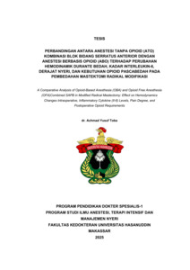 TOBA, ACHMAD YUSUF (2025) PERBANDINGAN ANTARA ANESTESI TANPA OPIOID (ATO) KOMBINASI BLOK BIDANG SERRATUS ANTERIOR DENGAN ANESTESI BERBASIS OPIOID (ABO) TERHADAP PERUBAHAN HEMODINAMIK DURANTE BEDAH, KADAR INTERLEUKIN-6, DERAJAT NYERI, DAN KEBUTUHAN OPIOID PASCABEDAH PADA PEMBEDAHAN MASTEKTOMI RADIKAL MODIFIKASI = A Comparative Analysis of Opioid-Based Anesthesia (OBA) and Opioid Free Anesthesia (OFA)Combined SAPB in Modified Radical Mastectomy: Effect on Hemodynamics Changes Intraoperative, Inflammatory Cytokine (Il-6) Levels, Pain Degree, and Postoperative Opioid Requirements. Thesis thesis, Universitas Hasanuddin.