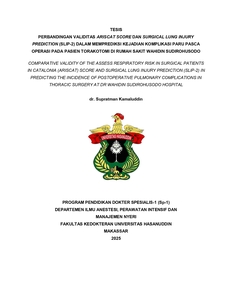KAMALUDDIN, SUPRATMAN (2025) PERBANDINGAN VALIDITAS ARISCAT SCORE DAN SURGICAL LUNG INJURY PREDICTION (SLIP-2) DALAM MEMPREDIKSI KEJADIAN KOMPLIKASI PARU PASCA OPERASI PADA PASIEN TORAKOTOMI DI RUMAH SAKIT WAHIDIN SUDIROHUSODO = COMPARATIVE VALIDITY OF THE ASSESS RESPIRATORY RISK IN SURGICAL PATIENTS IN CATALONIA (ARISCAT) SCORE AND SURGICAL LUNG INJURY PREDICTION (SLIP-2) IN PREDICTING THE INCIDENCE OF POSTOPERATIVE PULMONARY COMPLICATIONS IN THORACIC SURGERY AT DR WAHIDIN SUDIROHUSODO HOSPITAL. Thesis thesis, Universitas Hasanuddin.