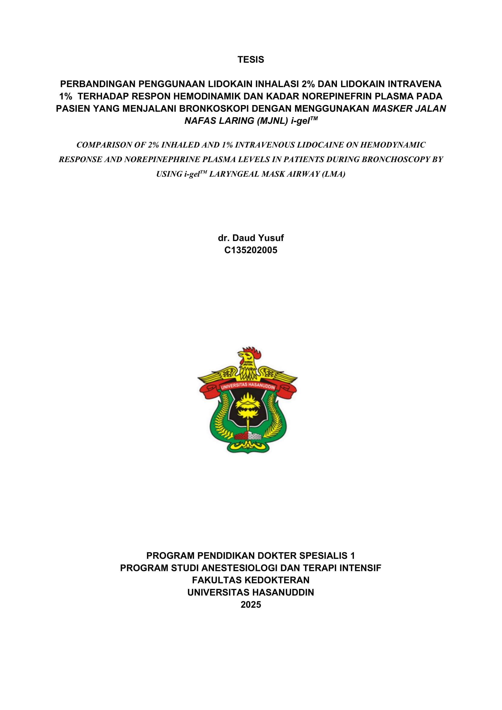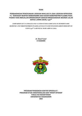 DAUD YUSUF. Perbandingan antara penggunaan lidokain inhalasi 2% dengan lidokain intravena 1% terhadap respon hemodinamik dan kadar norepinefrin plasma pada pasien yang menjalani bronkoskopi dengan menggunakan Masker Jalan napas laring (MJNL) i-gelTM (dibimbing oleh Andi Adil, Syafruddin Gaus) Latar Belakang: Bronkoskopi merupakan prosedur yang umum dilakukan untuk diagnosis dan tatalaksana penyakit saluran napas, namun prosedur ini dapat menimbulkan risiko desaturasi oksigen, terutama pada pasien dengan kondisi tertentu. Penggunaan Masker Jalan Napas Laring (MJNL) i-gel™ merupakan alternatif yang lebih praktis dibandingkan dengan penggunaan intubasi endotrakeal. Lidokain inhalasi, yang digunakan sebagai anestesi topikal pada mukosa saluran napas sebelum tindakan bronkoskopi, memiliki risiko efek samping sistemik yang lebih rendah dan dianggap lebih efektif dalam mengendalikan respons hemodinamik dibandingkan lidokain intravena. Penelitian ini bertujuan untuk membandingkan efek lidokain inhalasi 2% dan lidokain intravena 1% terhadap respons hemodinamik dan kadar norepinefrin plasma pada pasien yang menjalani bronkoskopi dengan menggunakan MJNL i-gel™. Metode: Penelitian ini merupakan studi eksperimental dengan desain uji klinis terkontrol secara acak dan single-blind yang dilakukan pada pasien yang menjalani prosedur bronkoskopi di Rumah Sakit Wahidin Sudirohusodo, Makassar. Pasien yang memenuhi kriteria inklusi dan eksklusi dipilih menggunakan metode consecutive sampling. Kelompok A menerima lidokain inhalasi 2%, sedangkan Kelompok B menerima lidokain intravena 1%. Parameter yang diamati meliputi pengukuran hemodinamik dan kadar norepinefrin plasma pada tiga titik waktu yang berbeda. Hasil: Sebanyak 46 pasien diikutsertakan dalam penelitian ini. Rerata usia subjek pada kelompok lidokain inhalasi 2% adalah 54,52 ± 13,29 tahun, sedangkan pada kelompok lidokain intravena 1% adalah 55,87 ± 13,01 tahun. Tidak terdapat perbedaan yang bermakna secara statistik antara kedua kelompok pada karakteristik dasar, termasuk usia, jenis kelamin, Indeks Massa Tubuh (IMT), dan status fisik menurut American Society of Anesthesiologists (ASA-PS). kelompok yang menerima lidokain inhalasi 2% menunjukkan respons hemodinamik yang secara signifikan lebih stabil selama prosedur bronkoskopi dibandingkan dengan kelompok yang menerima lidokain intravena 1%. Hal ini dibuktikan dengan perubahan (delta) yang lebih kecil dari nilai dasar pada tekanan darah sistolik, tekanan darah diastolik, frekuensi jantung, tekanan arteri rata-rata, dan kadar norepinefrin plasma. Kesimpulan: Lidokain inhalasi 2% lebih efektif dibandingkan lidokain intravena 1% dalam menekan respons hemodinamik dan menurunkan kadar norepinefrin plasma selama prosedur bronkoskopi dengan menggunakan MJNL i-gel™.