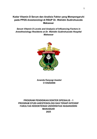 Kadar Vitamin D Serum dan Analisis Faktor yang Mempengaruhi pada PPDS Anestesiologi di RSUP Dr. Wahidin Sudirohusodo Makassar ABSTRAK Latar Belakang: Vitamin D memainkan peran penting dalam metabolisme tulang, fungsi kekebalan tubuh, dan kesehatan secara keseluruhan. Tenaga kesehatan, terutama mereka yang bekerja di dalam ruangan, mungkin memiliki risiko lebih tinggi mengalami defisiensi vitamin D karena terbatasnya paparan sinar matahari. Penelitian ini bertujuan untuk mengevaluasi kadar vitamin D dalam serum dan mengeksplorasi faktor-faktor yang berhubungan pada residen anestesiologi. Metode: Penelitian potong lintang retrospektif ini dilakukan pada 50 residen anestesiologi di RSUP Dr. Wahidin Sudirohusodo, Makassar, selama bulan Januari hingga Februari 2025. Data dikumpulkan melalui kuesioner yang diisi sendiri oleh peserta dan rekam medis. Kadar 25-hidroksivitamin D [25(OH)D] serum digunakan untuk menentukan status vitamin D. Analisis statistik dilakukan menggunakan SPSS versi 26, dengan nilai p < 0,05 dianggap bermakna. Hasil: Dari 50 peserta, 76% ditemukan mengalami defisiensi vitamin D. Tidak ditemukan hubungan yang bermakna antara kadar vitamin D dengan jenis kelamin, usia, atau indeks massa tubuh (IMT). Namun, defisiensi vitamin D lebih sering ditemukan pada residen dengan obesitas dan kelompok usia yang lebih muda. Suplementasi vitamin D (p = 0,022) dan durasi paparan sinar matahari (p = 0,029) menunjukkan hubungan yang bermakna dengan kadar vitamin D serum. Asupan makanan dan komorbiditas tidak menunjukkan hubungan yang signifikan dengan status vitamin D. Kesimpulan: Tingkat defisiensi vitamin D yang tinggi ditemukan di antara residen anestesiologi, kemungkinan besar disebabkan oleh keterbatasan paparan sinar matahari akibat pekerjaan. Suplementasi dan paparan sinar matahari secara teratur tampaknya menjadi faktor pelindung. Strategi yang ditargetkan, termasuk skrining rutin dan intervensi pencegahan, direkomendasikan bagi tenaga kesehatan yang berisiko.