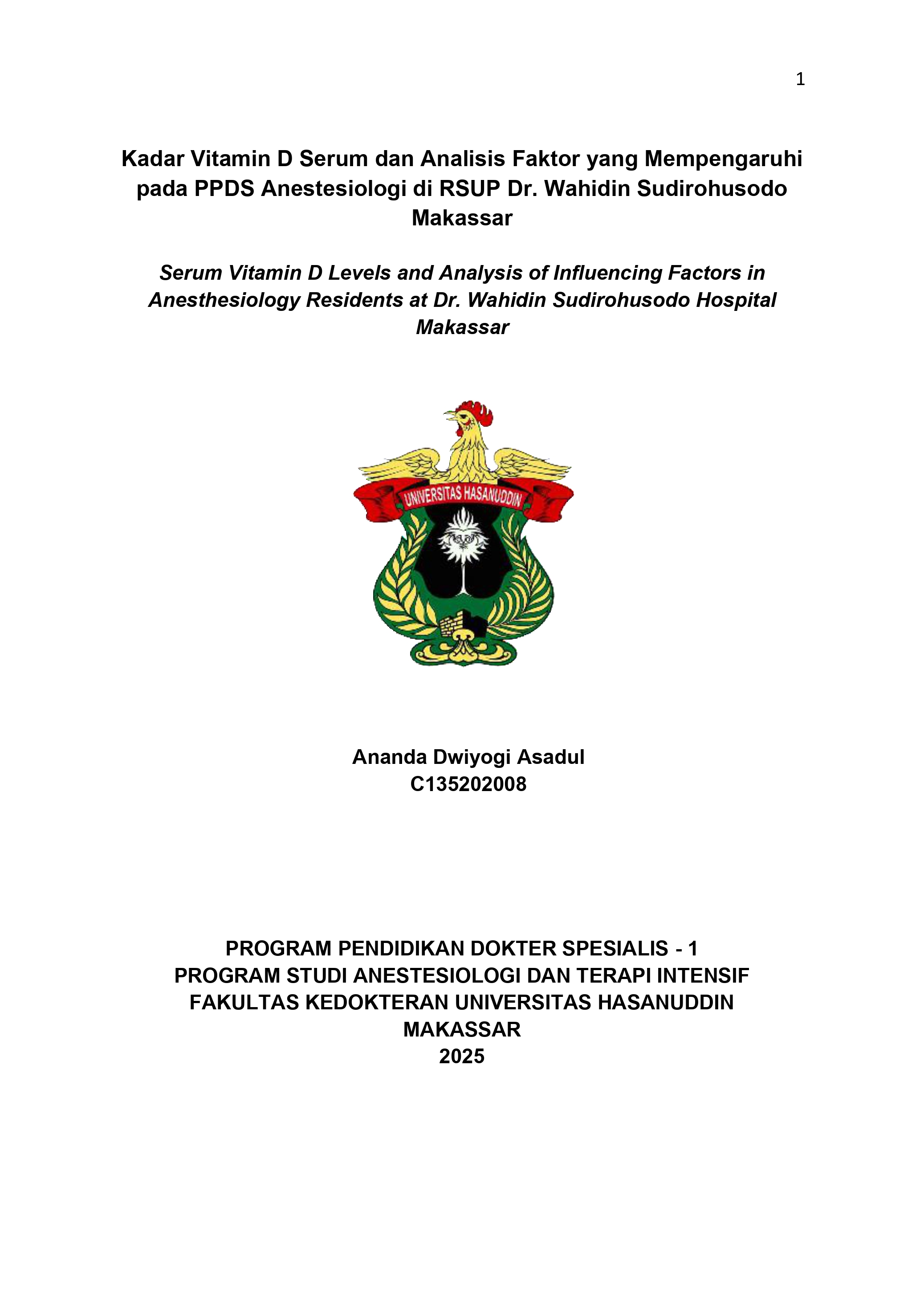 ASADUL, ANANDA DWIYOGI (2025) Kadar Vitamin D Serum dan Analisis Faktor yang Mempengaruhi pada PPDS Anestesiologi di RSUP Dr. Wahidin Sudirohusodo Makassar = Serum Vitamin D Levels and Analysis of Influencing Factors in Anesthesiology Residents at Dr. Wahidin Sudirohusodo Hospital Makassar. Thesis thesis, Universitas Hasanuddin.