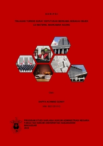 Daffa Achmad Dzaky (B02120103) dengan judul “Tinjauan Yuridis Surat Keputusan Bersama Menjadi Objek Uji Materiil Mahkamah Agung”. Di bawah bimbingan Prof. Dr. Marwati Riza S.H., M.Si. sebagai Pembimbing Utama. Penelitian ini bertujuan untuk mengetahui kedudukan Surat Keputusan Bersama (SKB) dalam hierarki Perundang-undangan dan untuk menganalisis dan mengetahui keabsahan Surat Keputusan Bersama yang dijadikan objek uji materiil Mahkamah Agung. Metode penelitian yang digunakan adalah normatif dengan pendekatan penelitian perundang-undangan dan konseptual. Bahan hukum yang digunakan yaitu bahan hukum primer berupa peraturan perundang-undangan, bahan hukum sekunder berupa bacaan literatur ilmiah, serta bahan non-hukum yang sejalan dengan objek kajian penelitian. Pengumpulan bahan hukum dengan teknik studi kepustakaan yang dianalisis dengan metode preskriptif. Hasil penelitian ini menunjukkan bahwa (1) Surat Keputusan Bersama (SKB) tidak memiliki kedudukan dalam hierarki peraturan perundang-undangan sebagaimana ditentukan dalam Undang-Undang Nomor 12 Tahun 2011. Secara formil maupun materiil, SKB bukanlah produk hukum yang sah menurut teori hukum bertingkat (Stufenbau Theory), karena tidak menarik kekuatan mengikatnya dari norma hukum yang lebih tinggi dan tidak dibentuk melalui prosedur legislasi yang berlaku. Oleh karena itu, SKB tidak dapat dijadikan dasar pembentukan norma hukum yang bersifat umum dan mengikat masyarakat luas. Penggunaan SKB untuk membatasi hak warga negara berpotensi melanggar prinsip legalitas serta menimbulkan ketidakteraturan dalam sistem hukum nasional. (2) Surat Keputusan Bersama dapat dijadikan objek uji materiil Mahkamah Agung apabila substansinya memenuhi karakteristik peraturan materiil, yaitu mengatur secara umum, berdampak ke luar, dan mengikat. Mahkamah Agung tidak hanya mempertimbangkan bentuk formal suatu produk hukum, tetapi juga isinya. Yurisprudensi seperti Putusan Nomor 17 P/HUM/2021 menjadi landasan penting dalam menegaskan pendekatan substansi ini. Sementara itu, dari perspektif hukum administrasi negara, SKB yang mengikat masyarakat harus tunduk pada AUPB sebagai prinsip dasar penyelenggaraan pemerintahan yang sah dan adil. Jika SKB menyimpang dari prinsip-prinsip tersebut, maka ia dapat diuji keabsahannya secara hukum melalui mekanisme pengujian materiil di Mahkamah Agung.
