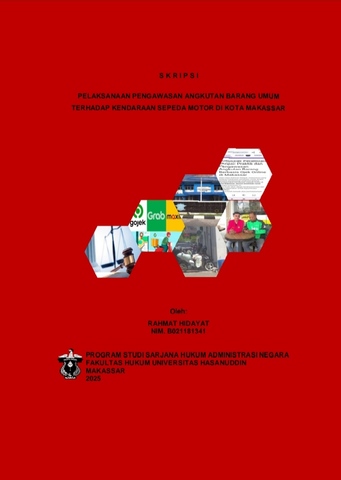 RAHMAT HIDAYAT (B021181341). Pelaksanaan Pengawasan Angkutan Barang Umum Terhadap Kendaraan Sepeda Motor di Kota Makassar. Dibimbing oleh Abdul Razak dan Andi Syahwiah A. Sapiddin sebagai Pembimbing. Penelitian ini dilatarbelakangi oleh meningkatnya praktik pengangkutan barang menggunakan sepeda motor melalui layanan aplikasi daring, yang belum sepenuhnya diimbangi dengan pengawasan yang memadai. Tujuan penelitian ini adalah untuk menganalisis pelaksanaan pengawasan serta penerapan sanksi administratif terhadap angkutan barang umum berbasis sepeda motor di Kota Makassar. Penelitian ini menggunakan metode penelitian hukum empiris kuantitatif dengan teknik pengumpulan data melalui kuesioner dan wawancara dengan pihak Direktorat Lalu Lintas Kepolisian Daerah (Ditlantas Polda Sulsel). Analisis dilakukan secara deskriptif berdasarkan data primer dan sekunder. Hasil penelitian menunjukkan bahwa pelaksanaan pengawasan masih belum optimal, bersifat insidentil, dan belum didukung dengan pendekatan edukatif yang kuat, baik oleh aparat maupun pihak aplikator. Sebagian besar pengemudi tidak mengetahui aturan teknis dan belum pernah mendapatkan pelatihan terkait pengangkutan barang. Pada sisi lain, penerapan sanksi administratif terhadap pelanggaran juga masih lemah, terbatas pada teguran lisan, dan belum menimbulkan efek jera. Kesimpulan dari penelitian ini menegaskan perlunya peningkatan intensitas pengawasan yang sistematis, penerapan sanksi yang konsisten, serta edukasi terpadu untuk meningkatkan kepatuhan dan keselamatan dalam aktivitas angkutan barang menggunakan sepeda motor.