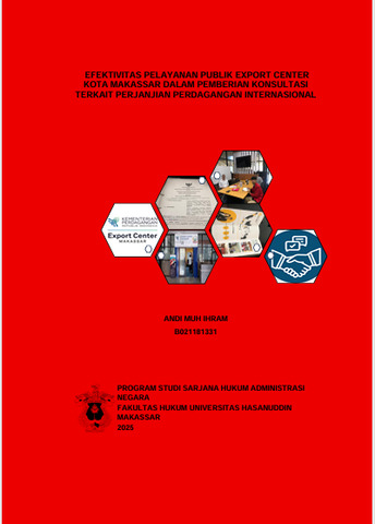 ANDI MUH IHRAM (B021181331). EFEKTIVITAS PELAYANAN PUBLIK EXPORT CENTER KOTA MAKASSAR DALAM PEMBERIAN KONSULTASI TERKAIT PERJANJIAN PERDAGANGAN INTERNASIONAL. Dibimbing oleh Prof. Dr. Marthen Arie, S.H., M.H. dan Eka Merdekawati Djafar, S.H., M.H. Penelitian ini bertujuan untuk mengetahui dan menjelaskan efektivitas pelayanan publik dari export center Makassar dan untuk mengetahui apakah pelayanan publik export center makassar mempengaruhi daya saing pelaku usaha makassar. Penelitian yang digunakan penulis yaitu penelitian empiris dengan menggunakan pendekatan kualitatif, data dan sumber data yang digunakan berupa data primer dan sekunder yang diperoleh dari hasil observasi, wawancara dan studi pustaka. Data yang diperoleh dianalisis dengan teknik deskriptif, penyajian data dan verifikasi.Hasil penelitian menunjukkan bahwa (1) Pelayanan publik ExportCenter Makassar dinilai sudah efektif dan efisien karena memudahkan akses konsultasi, baik online maupun offline. Namun, masih terdapat kekurangan, seperti tidak tersedianya situs web resmi yang memadai. Berbeda dengan Export Center Surabaya yang memiliki website dan transparansi informasi, ECM hanya mengandalkan media sosial seperti YouTube, Facebook, dan Instagram, sehingga akses informasi masih terbatas. (2) Kehadiran Export Center Makassar (ECM) terbukti meningkatkan daya saing masyarakat dalam ekspor, terlihat dari naiknya jumlah anggota Inaexport. Diharapkan ke depan ECM lebih aktif mensosialisasikan program ke daerah potensial, agar ekspor Indonesia makin berkembang dan peran ECM sebagai pusat layanan konsultasi ekspor di wilayah tengah dan timur lebih efektif. Dukungan pemerintah juga sangat dibutuhkan untuk mendukung kemajuan ECM.