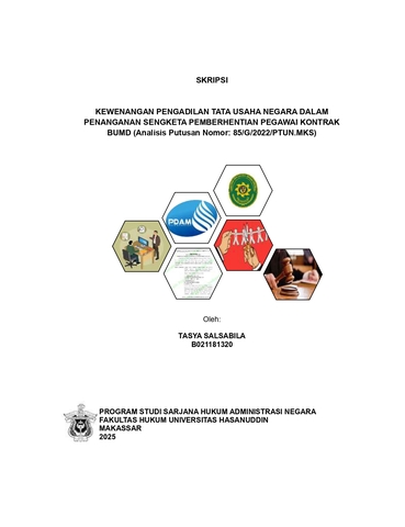 SALSABILA, TASYA (2025) KEWENANGAN PENGADILAN TATA USAHA NEGARA DALAM PENANGANAN SENGKETA PEMBERHENTIAN PEGAWAI KONTRAK BUMD (Analisis Putusan Nomor: 85/G/2022/PTUN.MKS) = The Authority of the Administrative Court in Handling Disputes over the Dismissal of Contract Employees in Regionally-Owned Enterprises (Analysis of Decision Number: 85/G/2022/PTUN.MKS). Skripsi thesis, UNIVERSITAS HASANUDDIN.