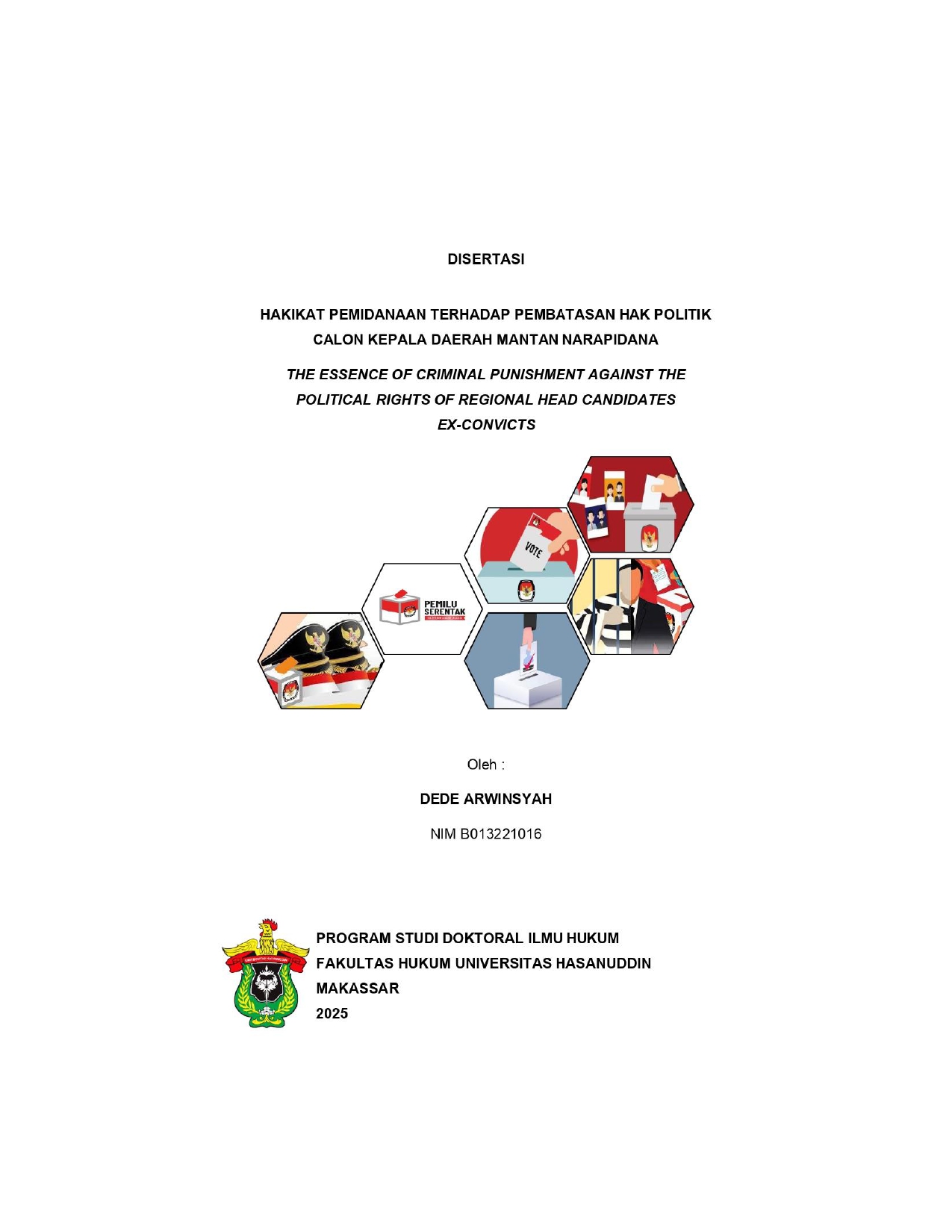 ARWINSYAH, DEDE (2025) HAKIKAT PEMIDANAAN TERHADAP PEMBATASAN HAK POLITIK CALON KEPALA DAERAH MANTAN NARAPIDANA = THE ESSENCE OF CRIMINAL PUNISHMENT AGAINST THE POLITICAL RIGHTS OF REGIONAL HEAD CANDIDATES EX-CONVICTS. Disertasi thesis, UNIVERSITAS HASANUDDIN.
