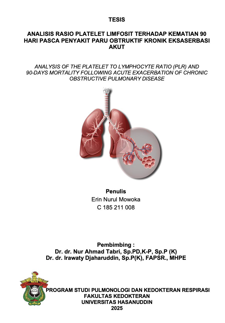 MOWOKA, ERIN NURUL (2025) ANALISIS RASIO PLATELET LIMFOSIT TERHADAP KEMATIAN 90 HARI PASCA PENYAKIT PARU OBTRUKTIF KRONIK EKSASERBASI AKUT = ANALYSIS OF THE PLATELET TO LYMPHOCYTE RATIO (PLR) AND 90-DAYS MORTALITY FOLLOWING ACUTE EXACERBATION OF CHRONIC OBSTRUCTIVE PULMONARY DISEASE. Thesis thesis, Universitas Hasanuddin.