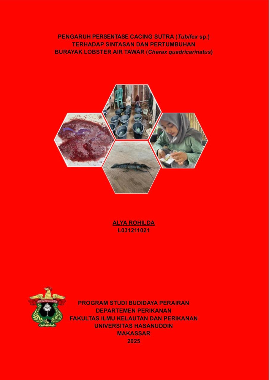 ROHILDA, ALYA (2025) PENGARUH PERSENTASE CACING SUTRA (Tubifex sp.) TERHADAP SINTASAN DAN PERTUMBUHAN BURAYAK LOBSTER AIR TAWAR (Cherax quadricarinatus) = THE EFFECT OF SILKWORM (Tubifex sp.) PERCENTAGE ON SURVIVAL AND GROWTH OF FRESHWATER LOBSTER FRY (Cherax quadricarinatus). Skripsi thesis, Universitas Hasanuddin.