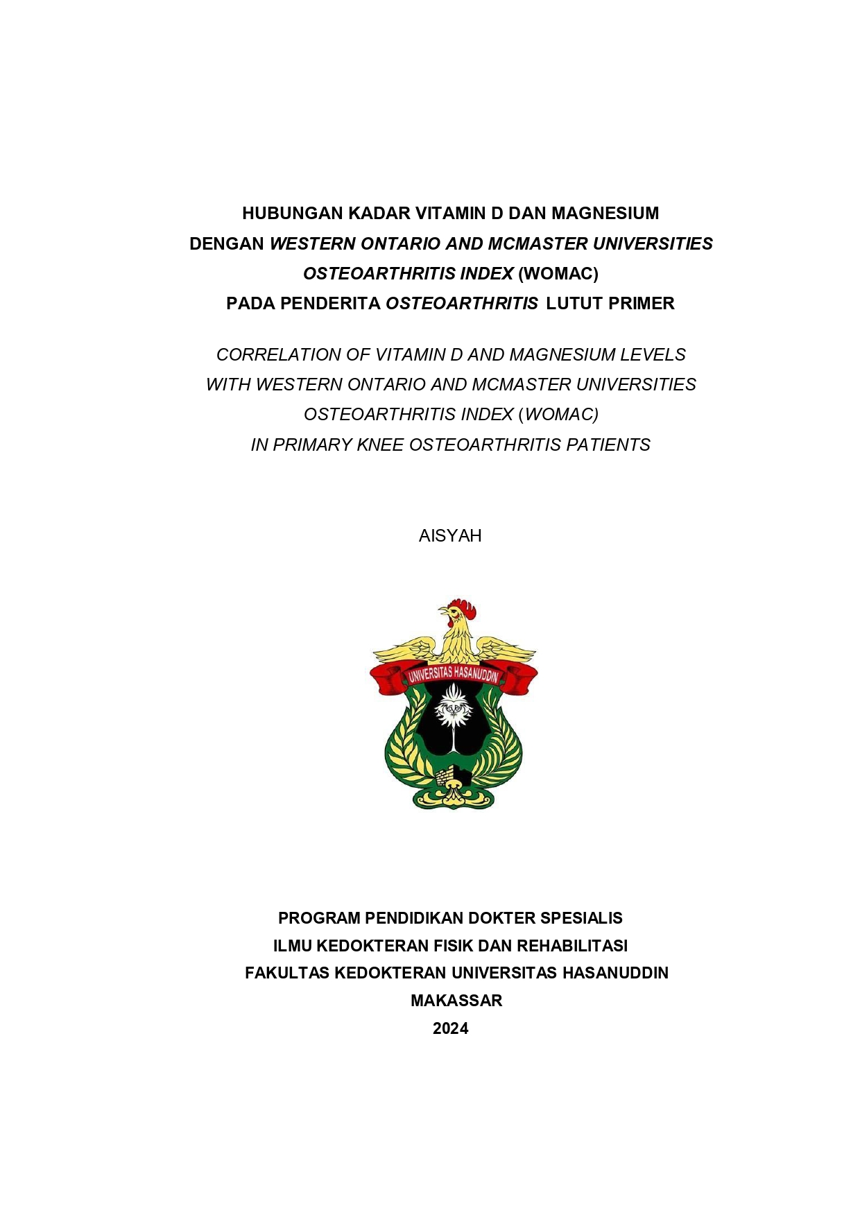 AISYAH, AISYAH (2025) HUBUNGAN KADAR VITAMIN D DAN MAGNESIUM DENGAN WESTERN ONTARIO AND MCMASTER UNIVERSITIES OSTEOARTHRITIS INDEX (WOMAC) PADA PENDERITA OSTEOARTHRITIS LUTUT PRIMER = CORRELATION OF VITAMIN D AND MAGNESIUM LEVELS WITH WESTERN ONTARIO AND MCMASTER UNIVERSITIES OSTEOARTHRITIS INDEX (WOMAC) IN PRIMARY KNEE OSTEOARTHRITIS PATIENTS. Thesis thesis, Universitas Hasanuddin.