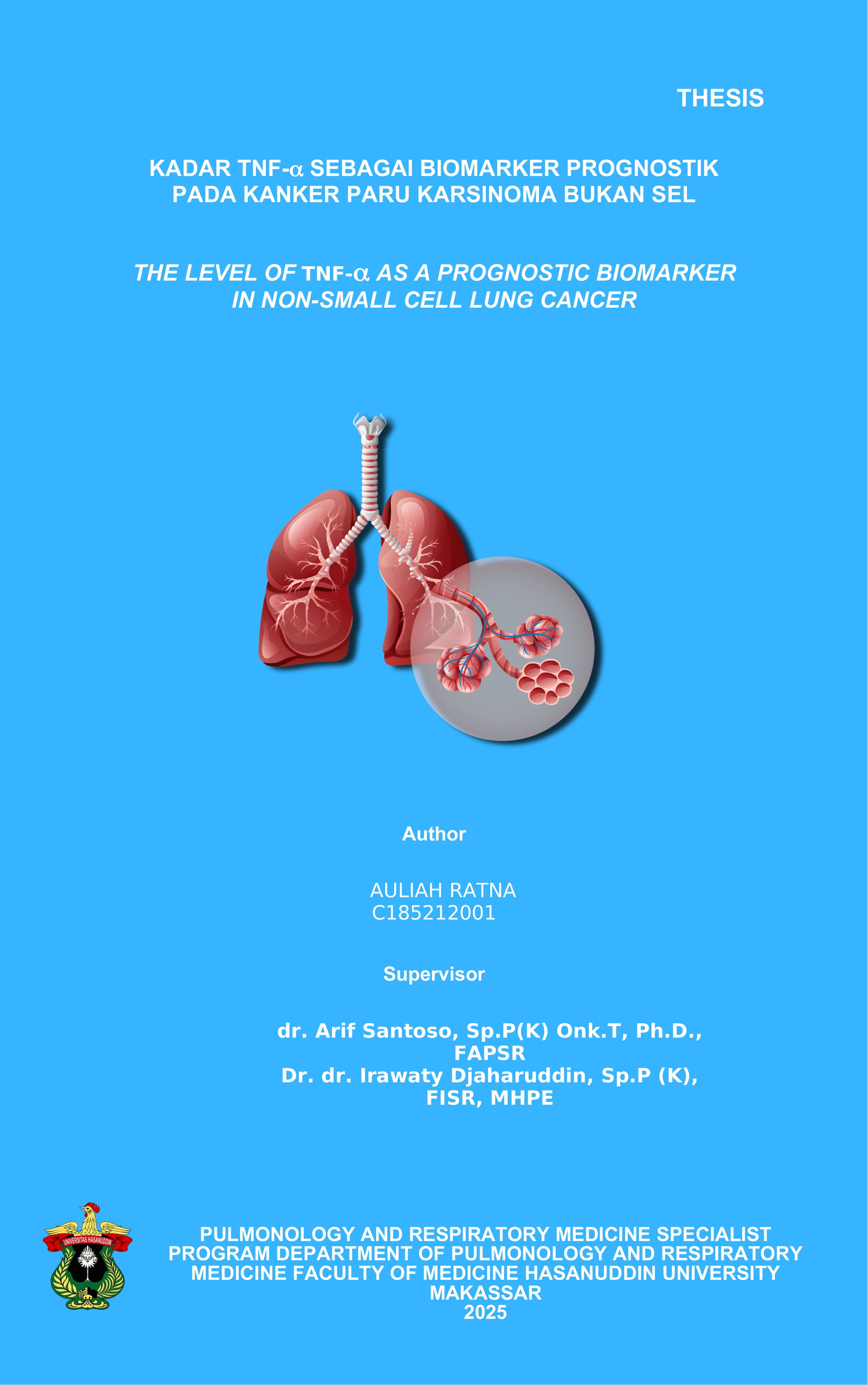 ABSTRAK Auliah Ratna. Kadar TNF-a Sebagai Biomarker Prognostik Pada Kanker Paru Karsinoma Bukan Sel Kecil. (dibimbing oleh dr. Arif Santoso, Dr. dr. Irawaty Djaharuddin) LATAR BELAKANG: Kanker Paru Karsinoma Bukan Sel Kecil (KPKBSK) merupakan jenis kanker paru yang paling umum, mencakup sekitar 85% dari seluruh kasus. Meskipun terdapat kemajuan dalam pengobatan, prognosisnya tetap buruk, terutama pada stadium lanjut. Tumor Necrosis Factor-alpha (TNF-α), suatu sitokin pro-inflamasi utama, telah dikaitkan dengan progresi dan prognosis kanker. Penelitian ini bertujuan untuk mengevaluasi kadar TNF-α sebagai biomarker prognostik pada KPKBSK METODE: Penelitian kohort prospektif ini mengikutsertakan pasien KPKBSK yang didiagnosis di RSUP Dr. Wahidin Sudirohusodo Makassar dari April 2022 hingga Maret 2023. Kadar TNF-α diukur dalam sampel Bilasan bronkoalveolar (BAL) menggunakan Enzyme-Linked Immunosorbent Assay (ELISA). Pasien dipantau untuk progresi penyakit dan tingkat kelangsungan hidup satu tahun. Data dianalisis untuk menilai korelasi antara kadar TNF-α dan luaran klinis. HASIL: Sebanyak 66 pasien KPKBSK dan 22 subjek kontrol diikutsertakan. Kadar TNF-α secara signifikan lebih tinggi pada pasien KPKBSK dibandingkan dengan kontrol (p < 0,05). Peningkatan kadar TNF-α dikaitkan dengan stadium tumor lanjut (p = 0,001) dan tingkat kelangsungan hidup keseluruhan yang lebih rendah (p = 0,003). Pasien dengan kadar TNF-α tinggi menunjukkan kelangsungan hidup bebas progresi yang lebih pendek dibandingkan dengan mereka yang kadarnya lebih rendah. Analisis multivariat mengonfirmasi TNF-α sebagai faktor prognostik independen untuk KPKBSK. KESIMPULAN: Kadar TNF-α berfungsi sebagai biomarker prognostik potensial pada KPKBSK, yang berkorelasi dengan progresi penyakit dan luaran kelangsungan hidup. Memasukkan penilaian TNF-α ke dalam praktik klinis dapat meningkatkan evaluasi prognostik dan memandu strategi pengobatan yang dipersonalisasi. Penelitian lebih lanjut dengan kohort yang lebih besar dan tindak lanjut yang lebih lama diperlukan untuk memvalidasi temuan ini. KATA KUNCI: Kanker paru, Kanker Paru Bukan Sel Kecil, TNF-a, Biomarker Prognostik, Bilasan Bronkus, Serum, Analisis Kelangsungan Hidup.
